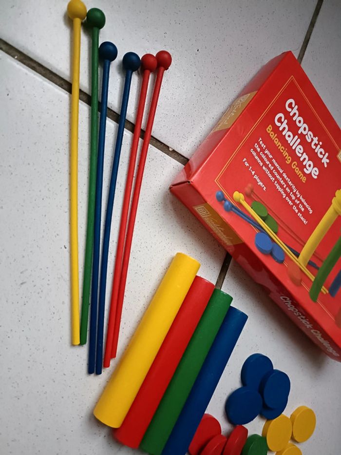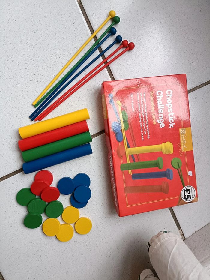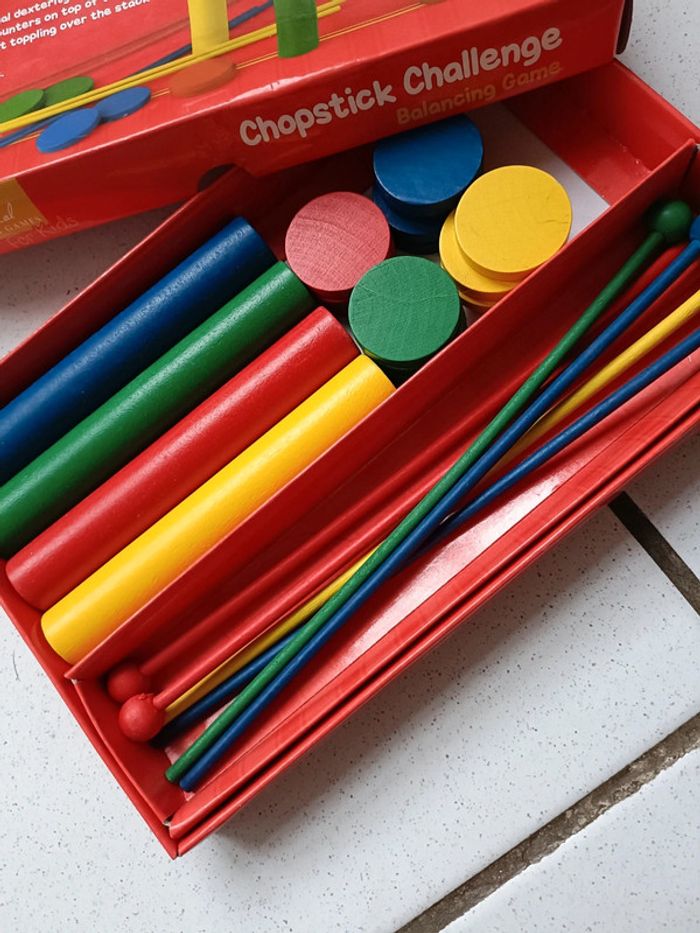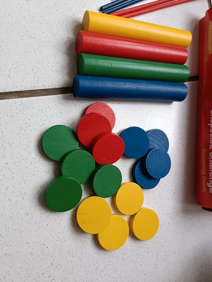 Jeu d'adresse en bois Montessori Incomplet : il manque 2 baguettes et un jeton mais on peut toujours s'en servir Couleurs : jaune, rouge, bleu et vert En bois Très bon état ➡️ #ursullabuffayjeuxenbois