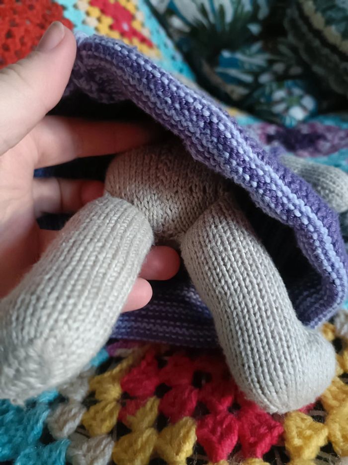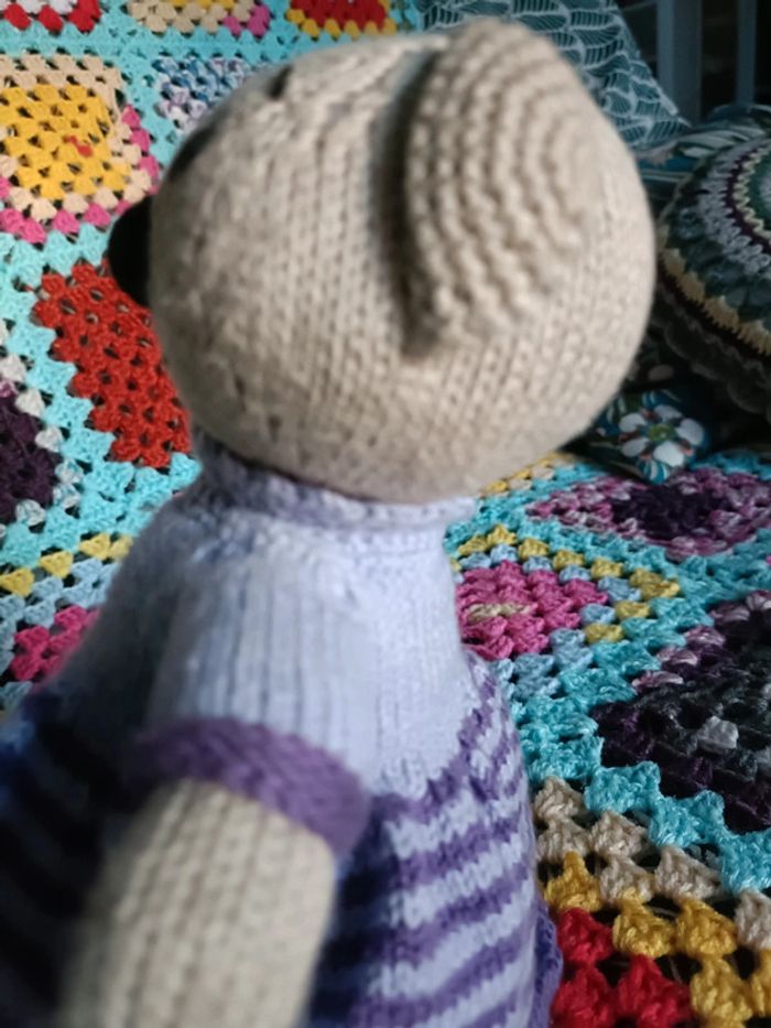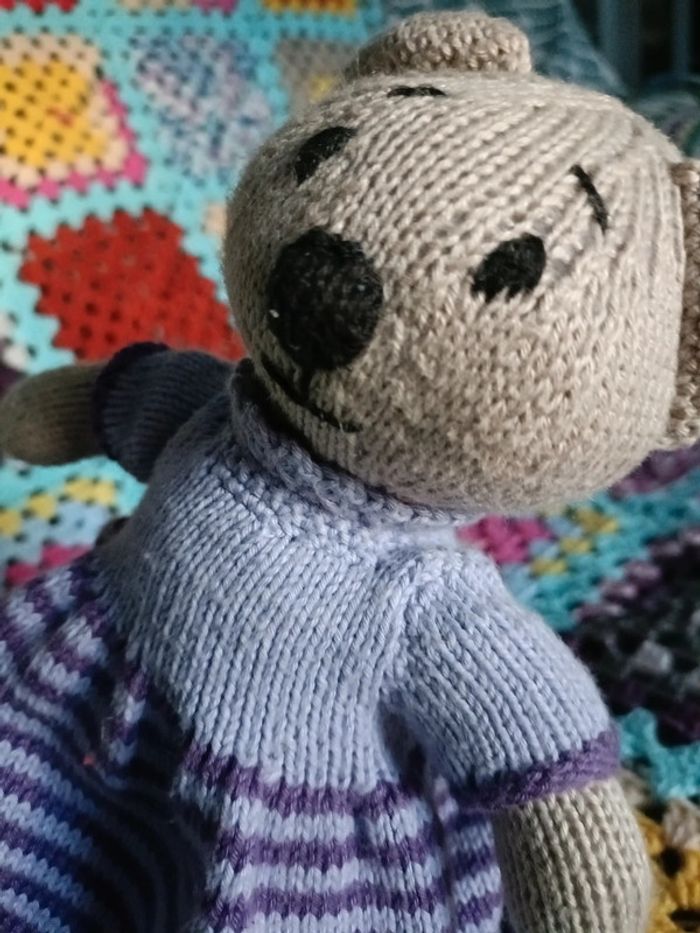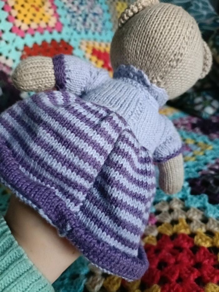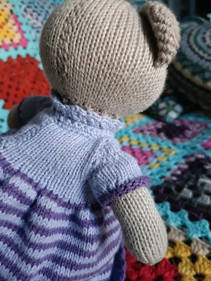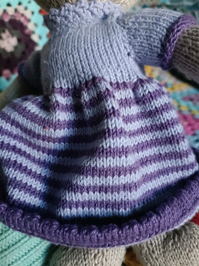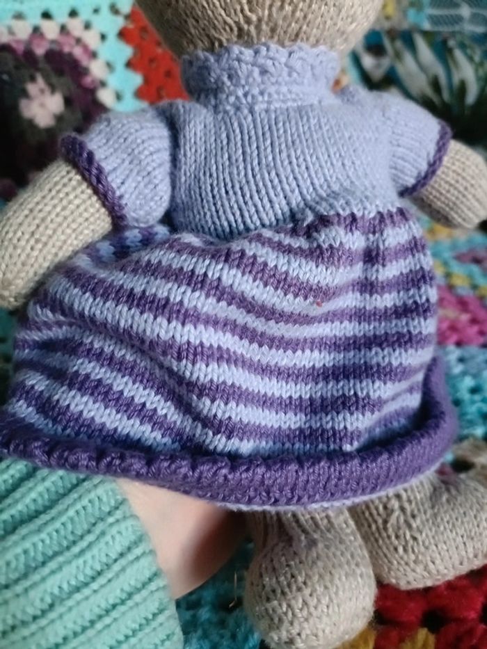 Ours marron clair avec sa robe violette Très bon état Environ 25cm de haut Tricoté à la main ➡️ #ursullabuffaypeluches