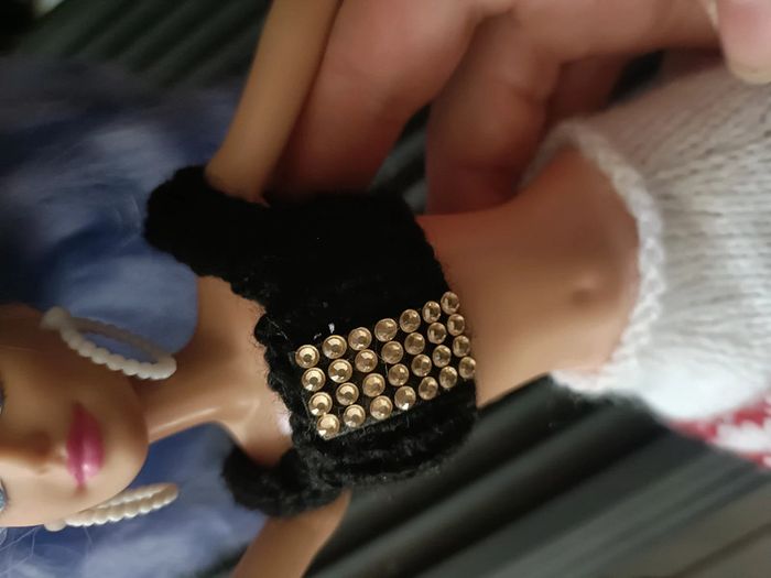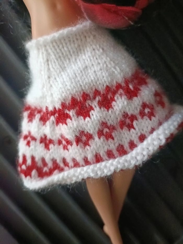 ⚠️ la poupée n'est pas en vente, seulement les vêtements ⚠️ Tenue composée de : - un haut crop top noir avec strass dorés - une jupe blanche avec motifs norvégiens rouges Très bon état Tricoté main D'autres vêtements par ici : #creationsdursulla ➡️ #ursullabuffaybarbie