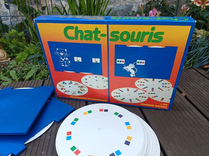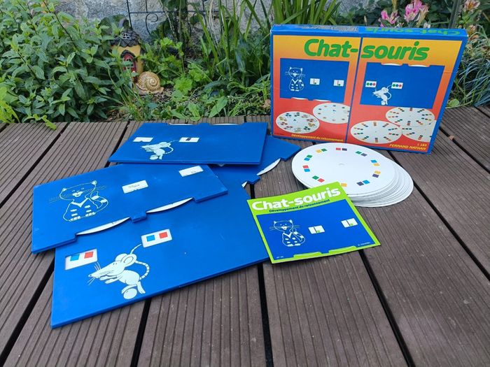Jeu d'apprentissage vintage Chat-souris Il y a 4 boitiers et 30 disques (le jeu est donc complet !) C'est une manière ludique de développer le raisonnement chez l'enfant (émet des hypothèses, se questionne, fait appel à sa logique etc) Jeu éducatif En très bon état ➡️ #ursullabuffayjeuxdesociété