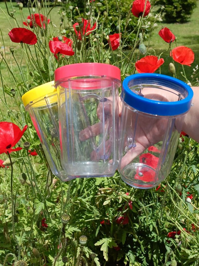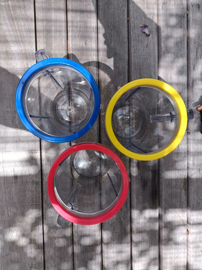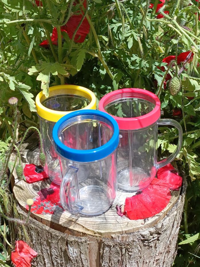Lot de 3 grands verres a smoothie avec anses Couleurs: rouge, jaune et bleu Très bon état Grande contenance (environ = à une cannette) ➡️ #ursullabuffayvaisselle