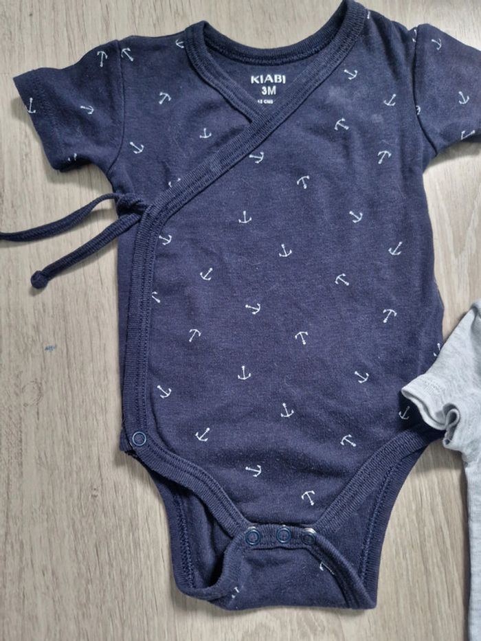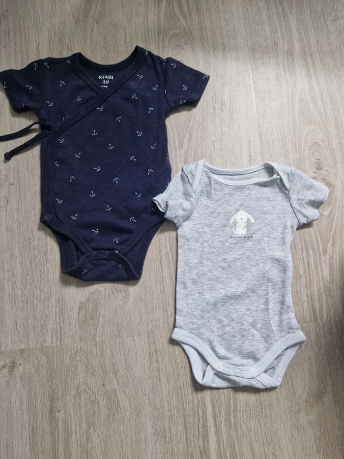 lot de 2 bodys manches courtes taille 3 mois couleur bleu marine et gris bleu = kiabi ouverture devant gris = obaibi pressions seulement en bas très bon état