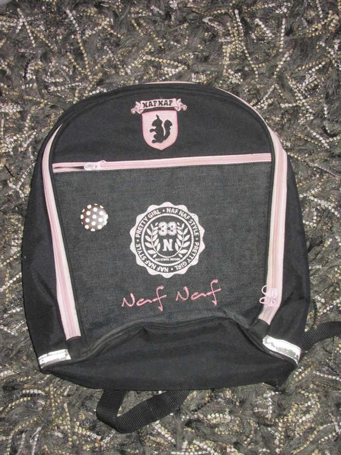 sac à dos naf naf avec une grande poche devant et 2 fermetures éclaires derrière sac à dos de taille moyenne (environ 35 cm de long)
