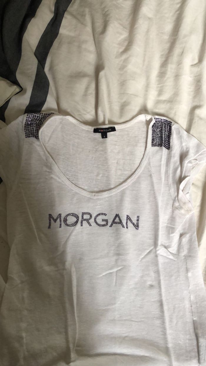 peu porté, t-shirt blanc un peu transparent, épaule avec des sequins