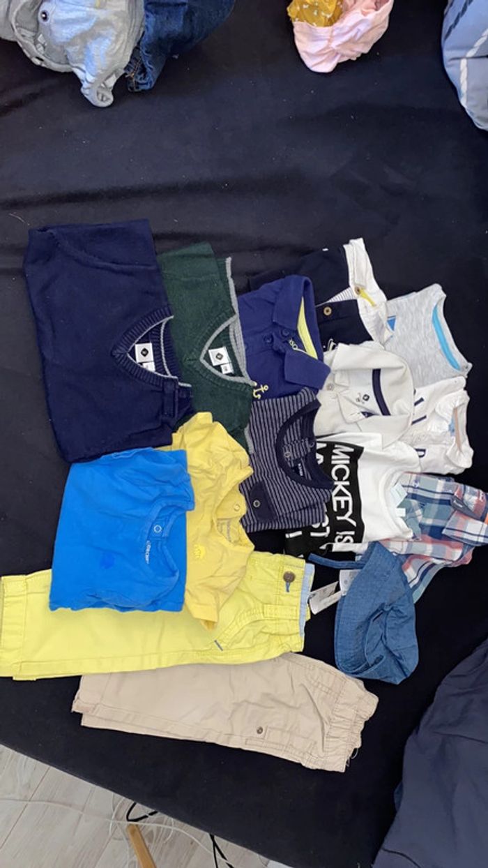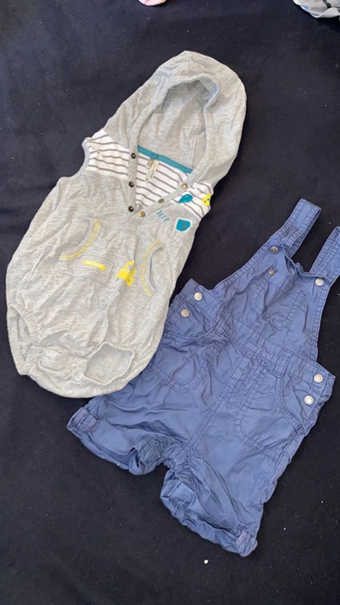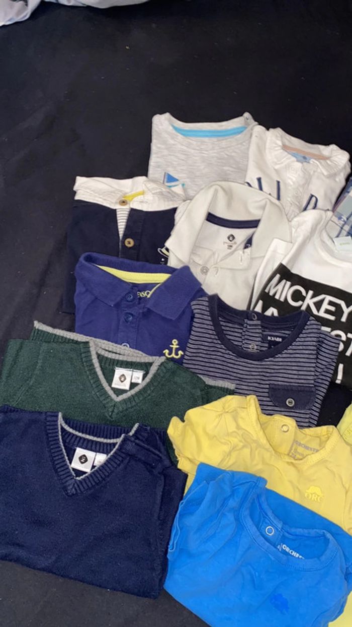 Différentes marques comporte: - 2 bodies manche courte - 1 barboteuse - 2 salopettes légères - 1 salopette en jeans - 2 pantalons légers - 2 pulls fins - 1 chemise manches courtes -7 tee shirt/polos - 1 bob jamais porté