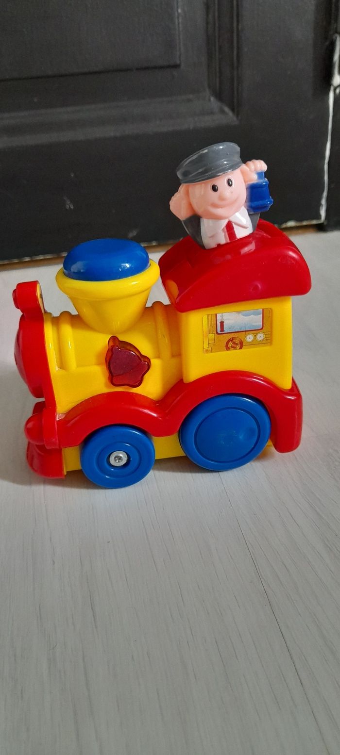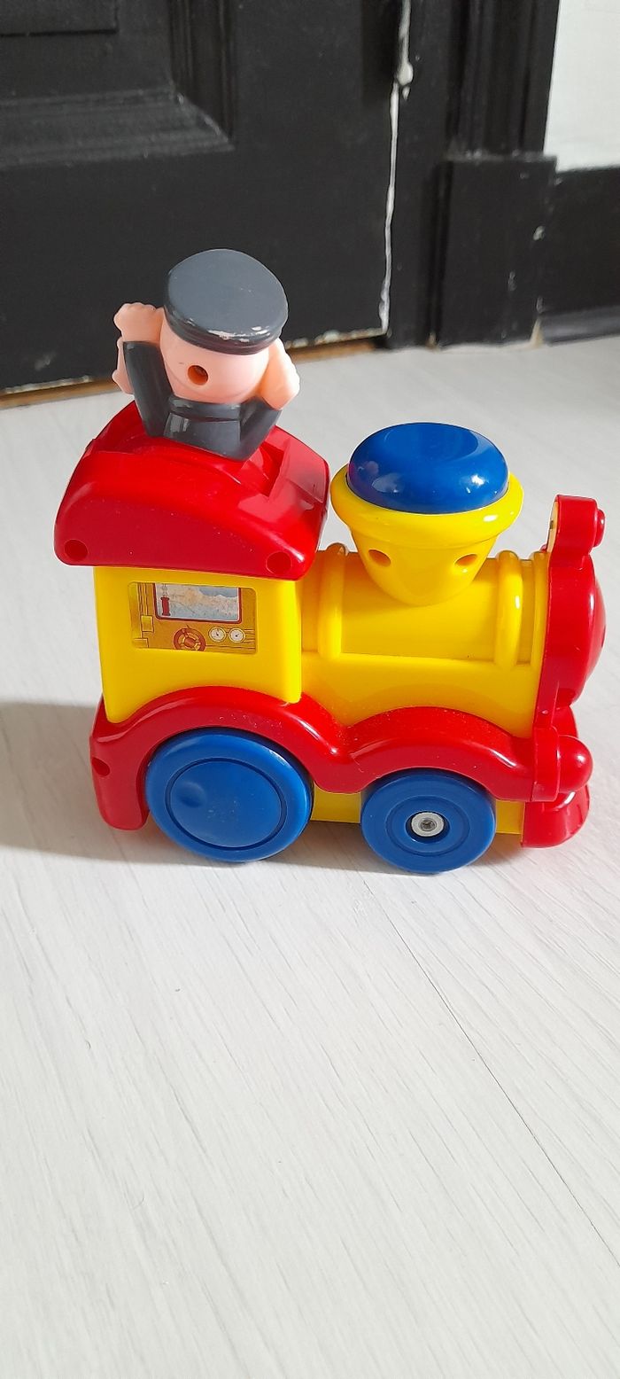 Petit train à faire rouler Quand il roule le bonhomme bouge de gauche à droite Quand l'enfant appuie sur la cloche il sort différants son Très très bon état