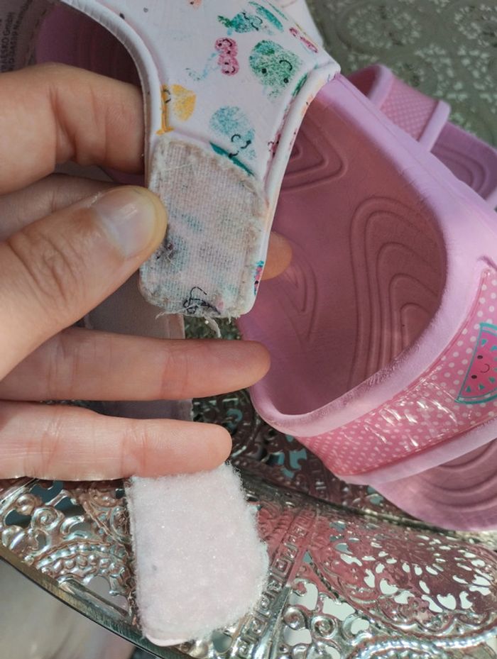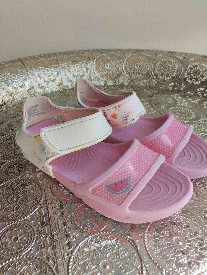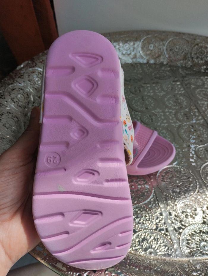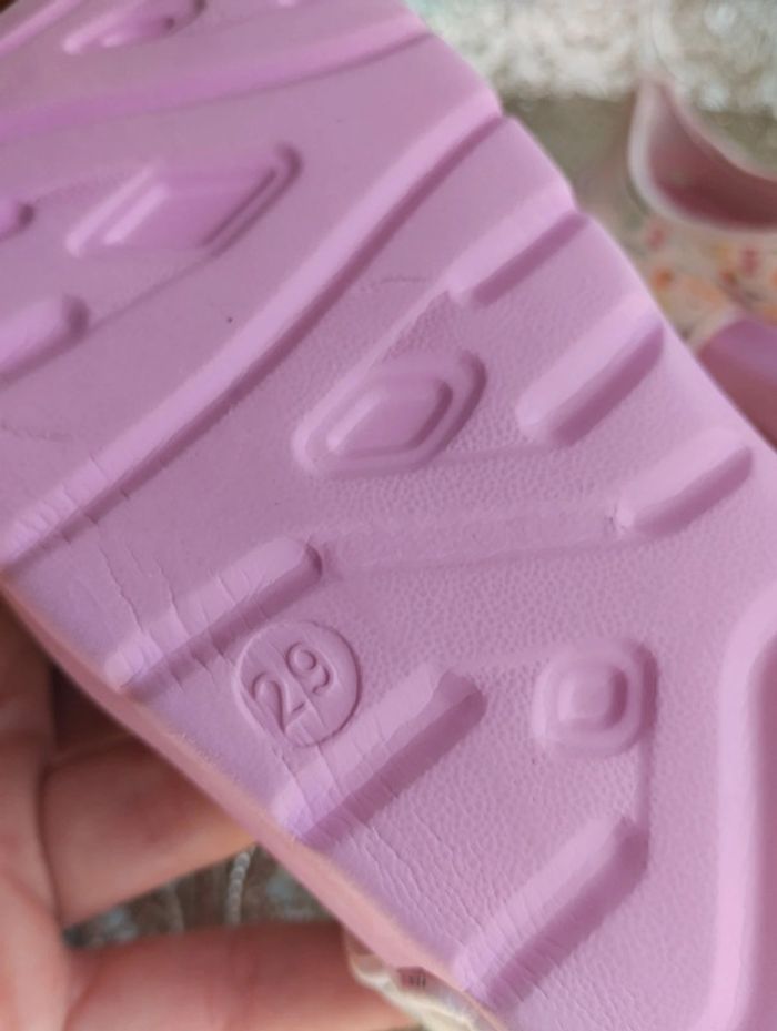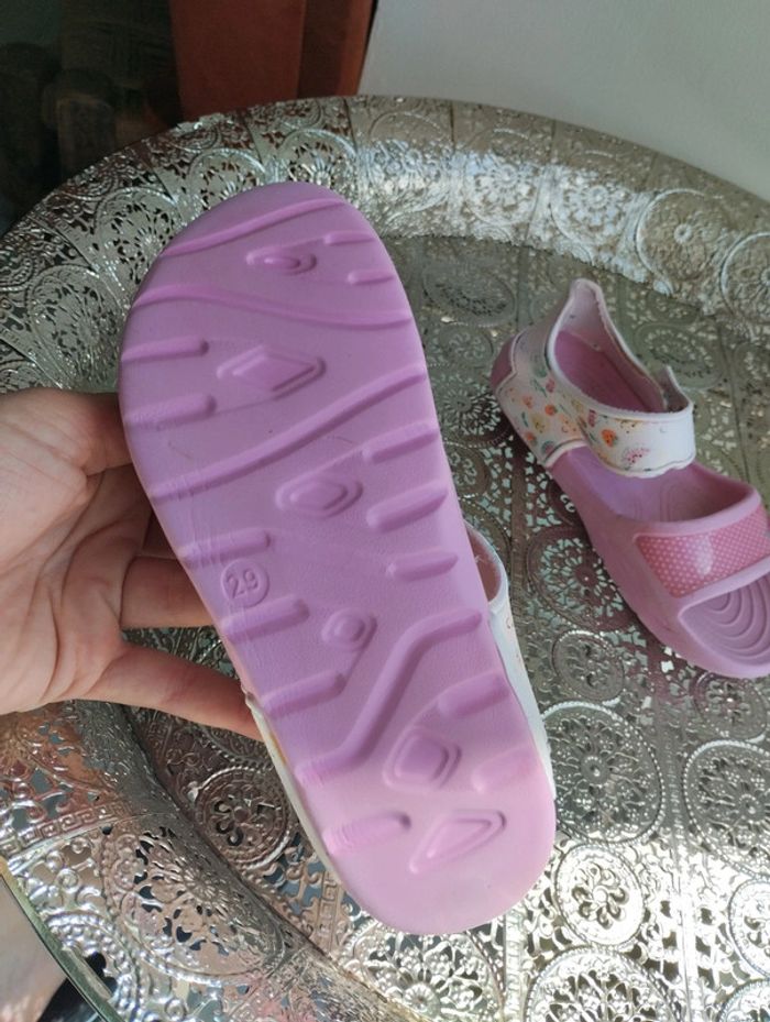 Chaussures en plastique style crocs. Semelle en parfait état servies comme chaussons en classe. Le Scratch un peu usé et les dessins sur la partie rose clair aussi. #chaussures #taille29
