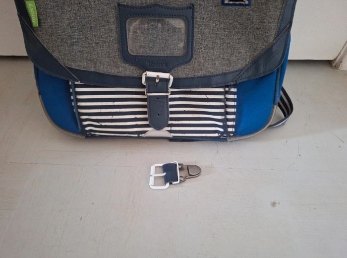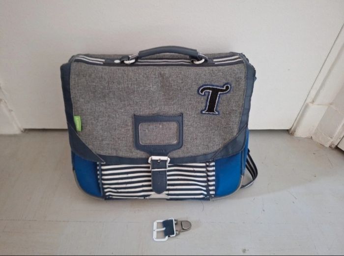Cartable Louis 35 cm à 1 compartiment, idéal pour CP / CE1 En bon état général, seule une légère usure des bandes blanches décoratives et des angles du fond est à signaler, voir les photos Boucle de fermeture de rechange d'origine fournie