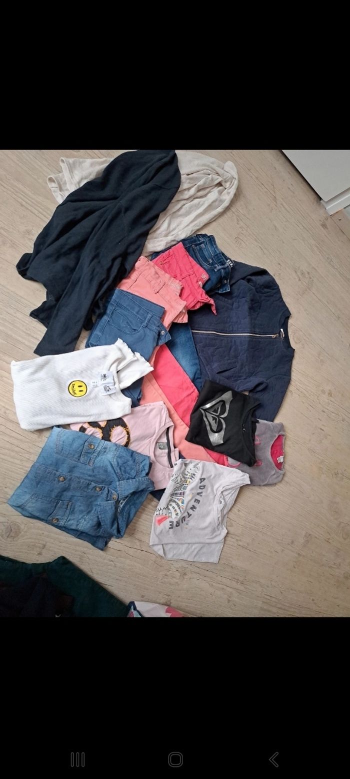 Lot 13 habits fille 10 ans comprenant : 2 pantalons roses TAO (quelques traces sur le rose foncé) 1 Jean stretch bleu la halle 1 pantacourt bleu kiabi 2 gilets kiabi 1 veste TAO matelassée cœurs 1 chemise denim kiabi 1 tee shirt smiley jennyfer 1 tee shirt manches longues zara 1 tee shirt roxy 1 tee shirt H&M 1 haut de pyjama okaidi