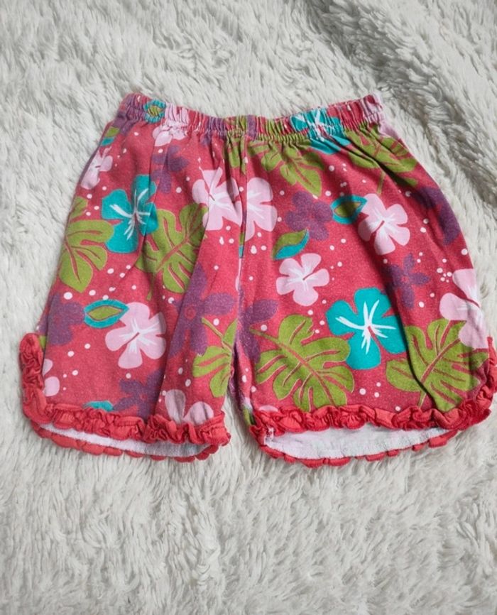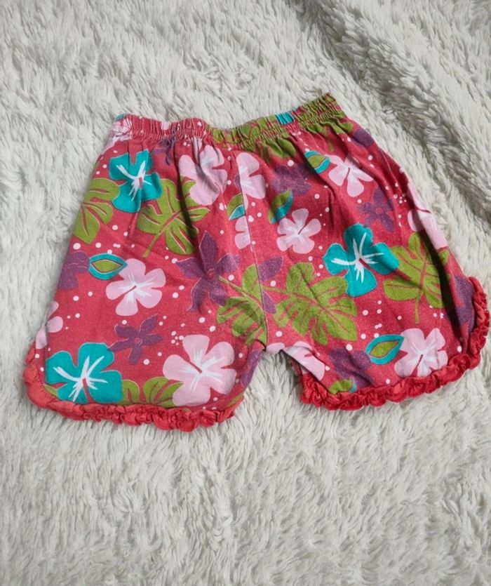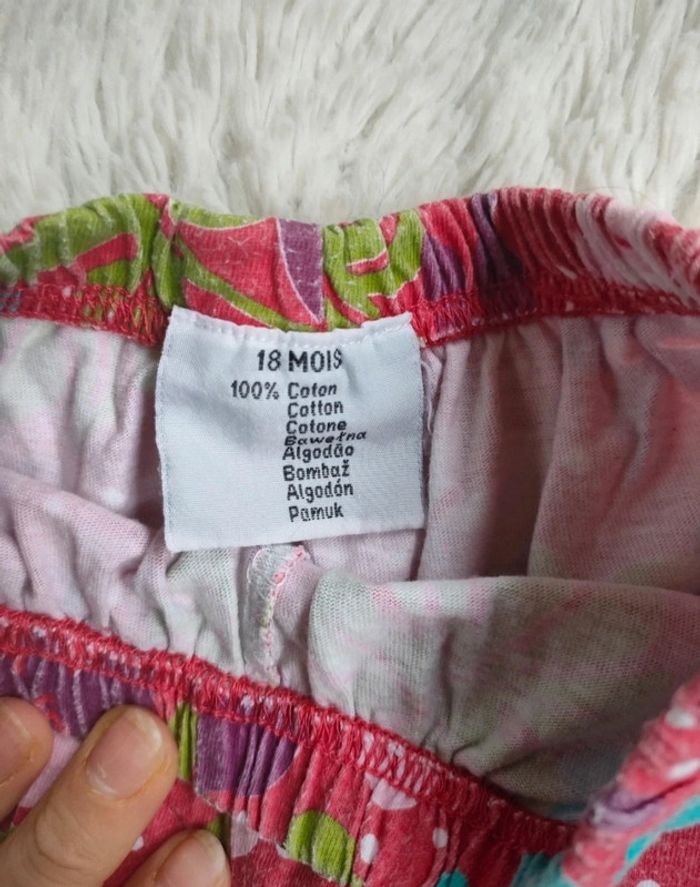 Short rouge avec des motifs fleurs et feuilles. Élastique à la taille Taille : 18 mois Matière : 100 % coton