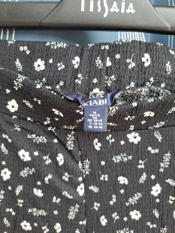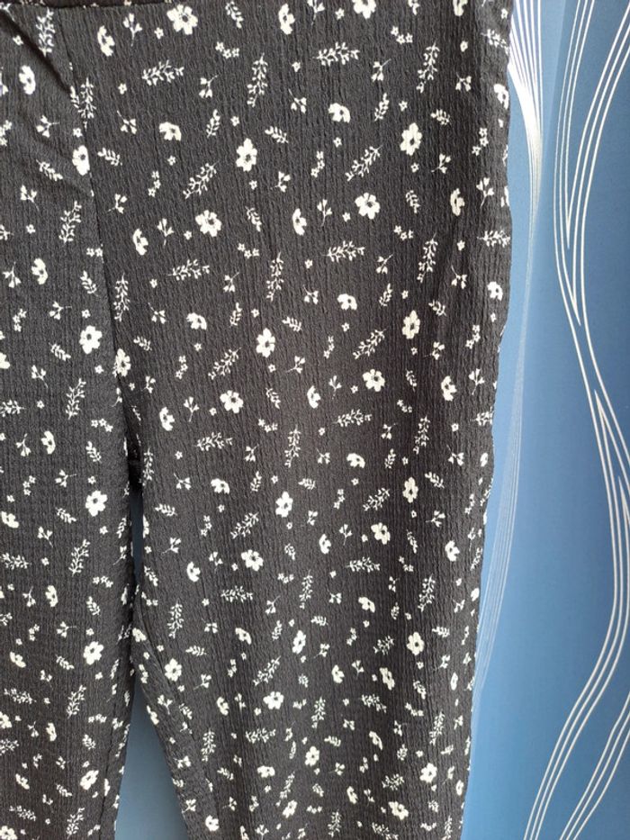 Pantalon été, crépon, jambes larges évasées, Kiabi, T 38-40, Neuf jamais porté, imprimé fleurs écru sur fond noir. Long entrejambe 80cm, larg bas 28cm, 99% polyester 1% elasthanne.