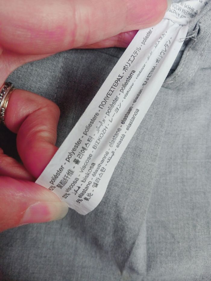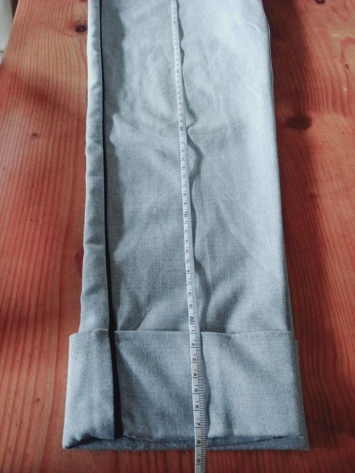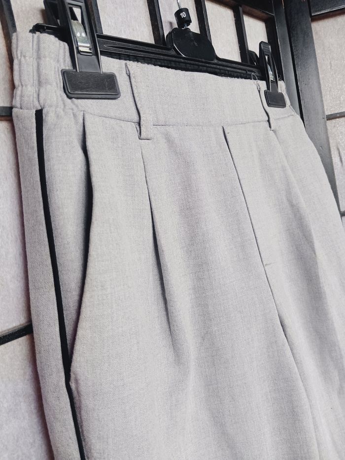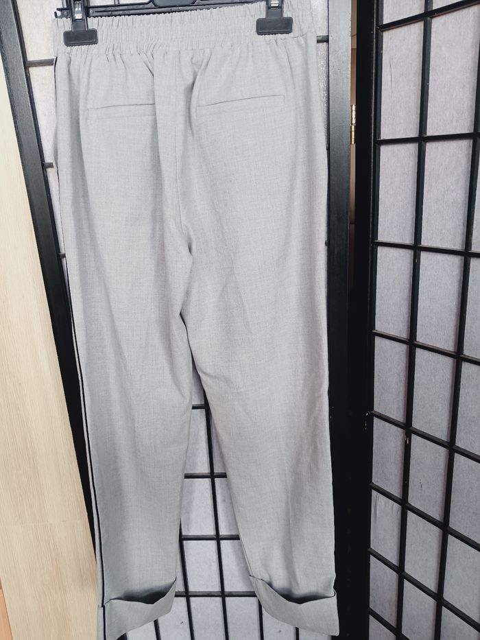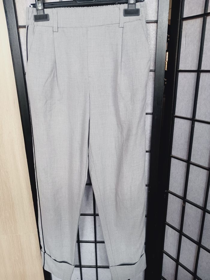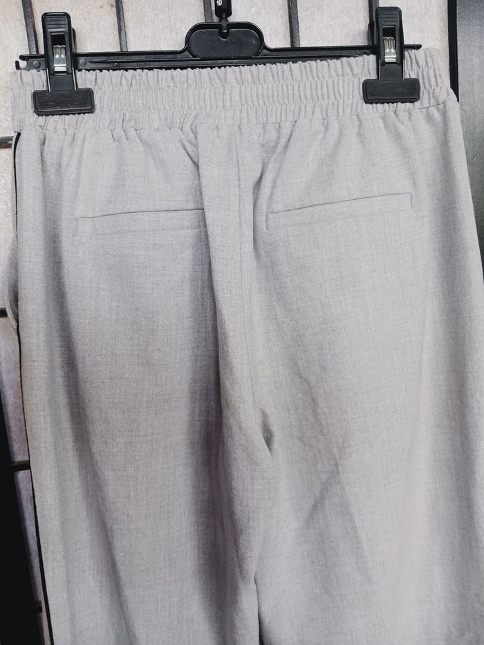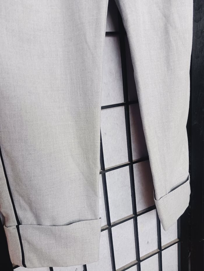 Pantalon gris et liseret noir, 2 poches sur les côtés et 2 fausses derrière. Passage pour une ceinture Longueur : 88 cm Photo du vêtement porté impossible