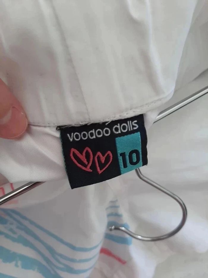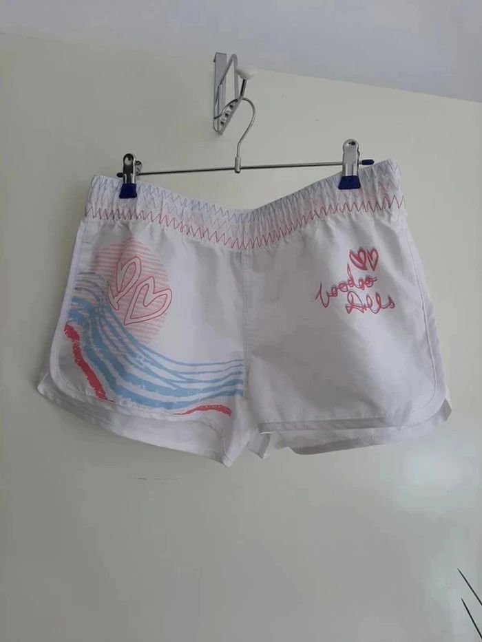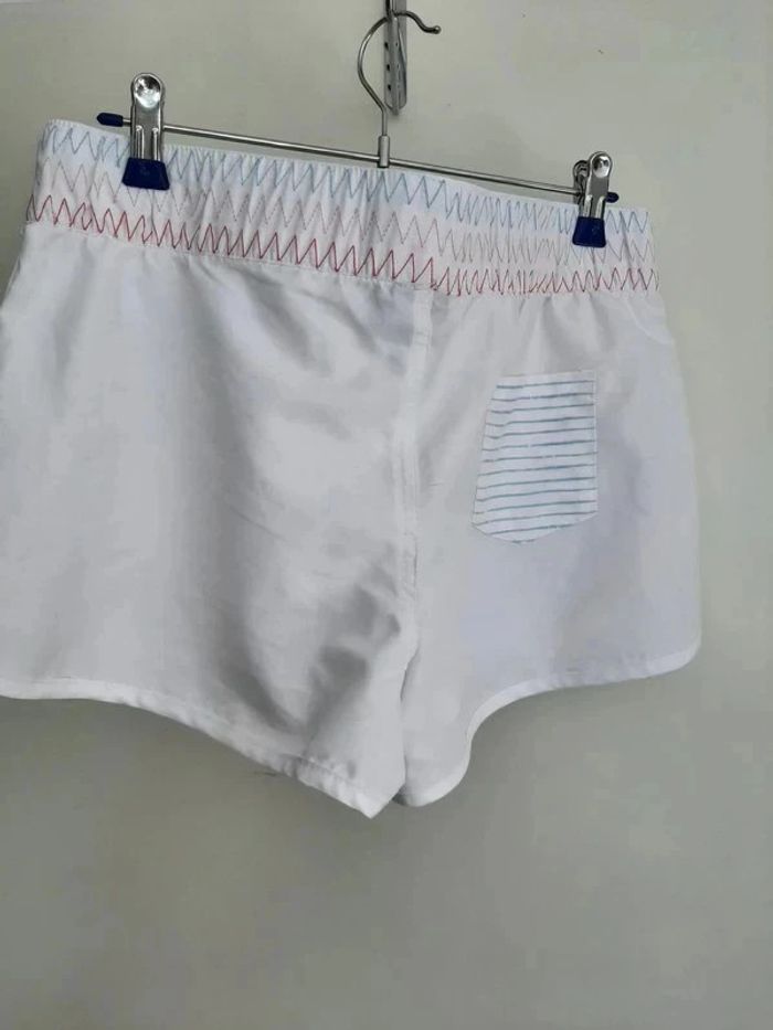 Short de plage blanc avec motifs roses et bleus. Juste petite ligne à l'arrière (voir photo) mais jamais porté. Taille M.