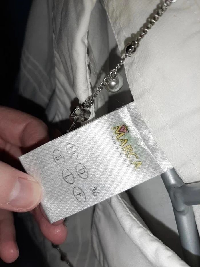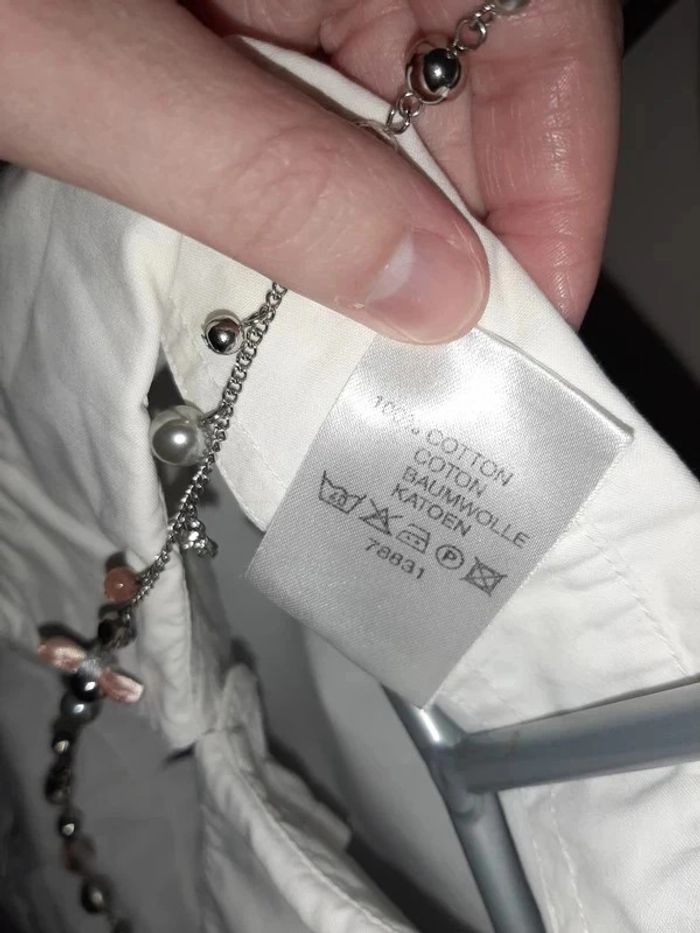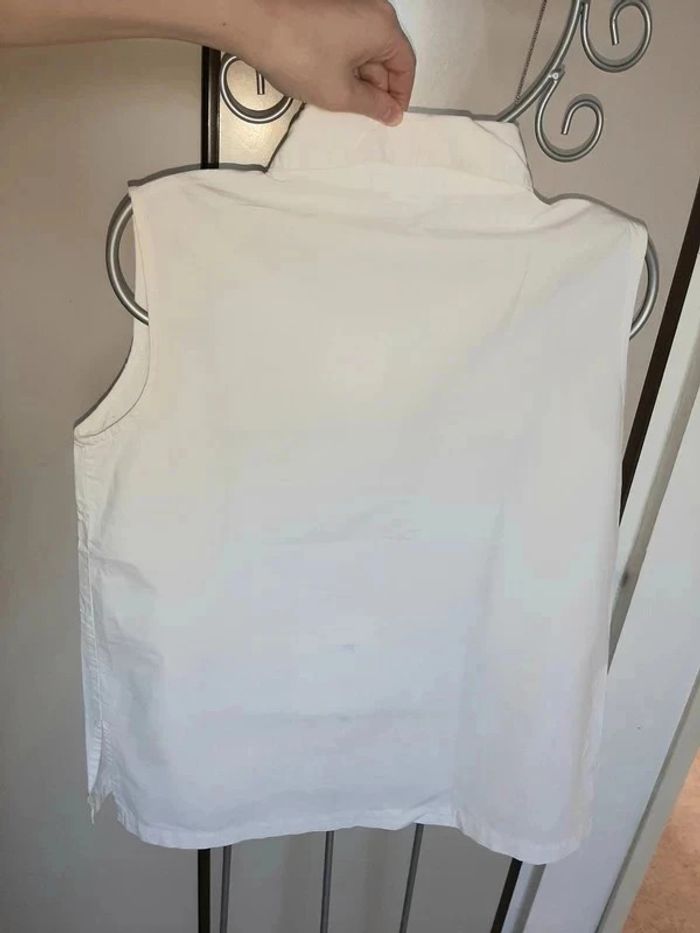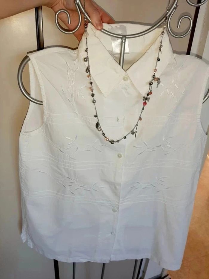 Superbe chemise blanche sans manches avec motifs "feuilles" dessus. Col, 100% coton en excellent état. Taille 36. Elle est sublime. Je la vends au prix de 12 euros. #TailleS36marine