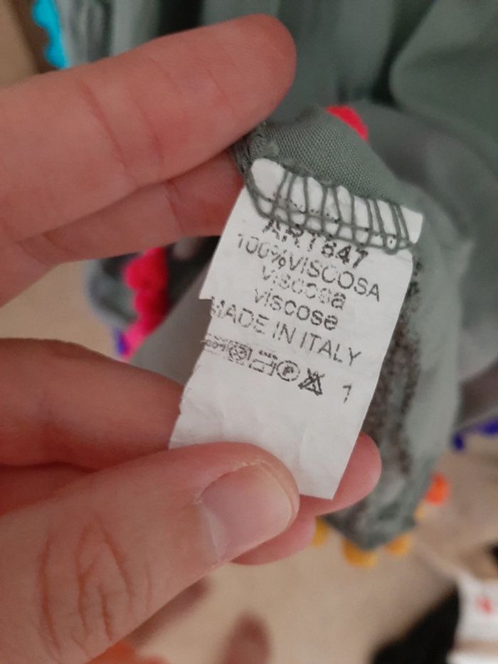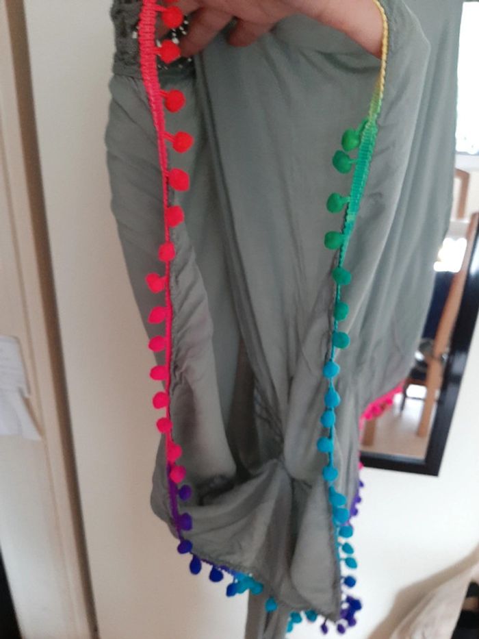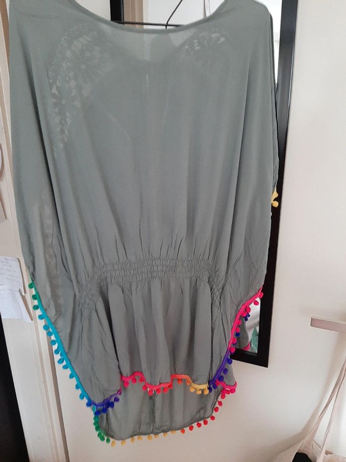 Haut à mettre au-dessus d'un maillot ou bikini pour la plage, piscine, etc. Taille unique. Gris avec pompons colorés multicolores. Élastique à la taille. Détails dans le dos. Jamais porté.