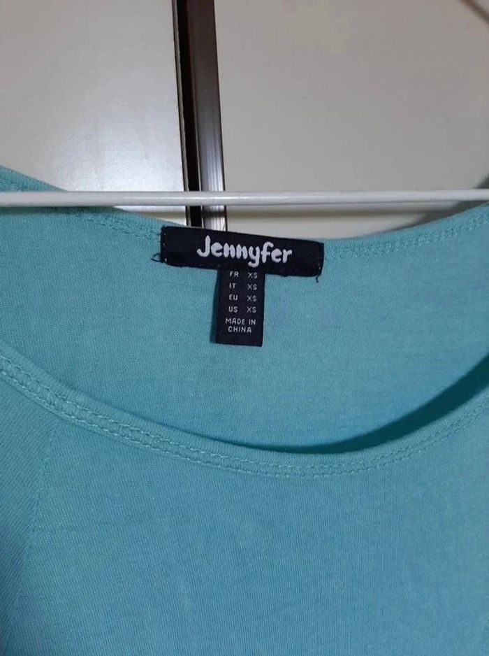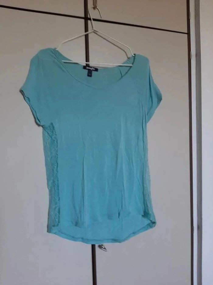 T-shirt turquoise Jennyfer taille XS. Matière légère et flottante. Sur les côtés, lanière en dentelles transparente. Porté 1 fois peut-être. Je le vends au prix de 7 euros. #TailleXS34marine