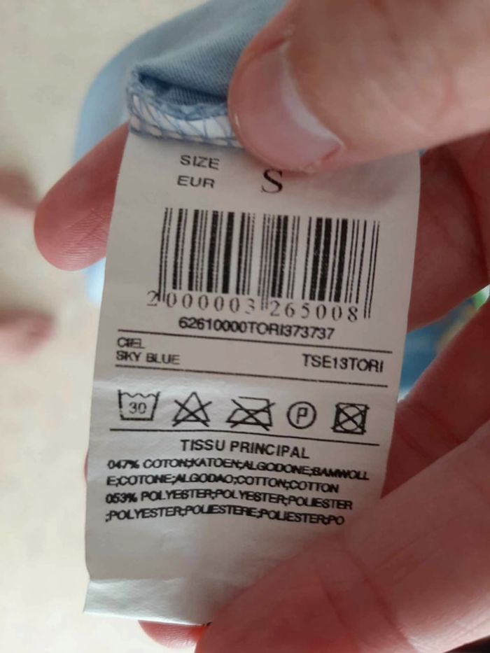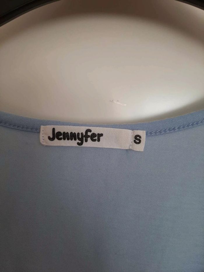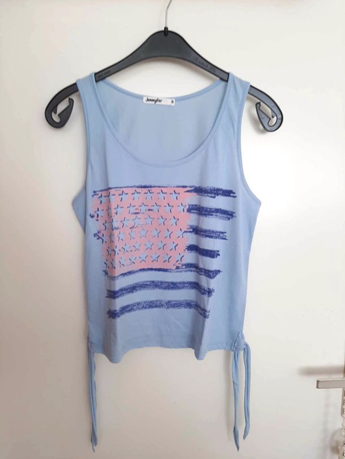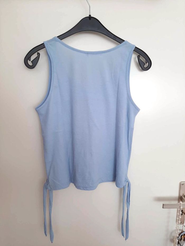 Beau top bleu ciel avec motif, Jennyfer taille S. Très léger et ample. Petit décolleté arrondi. Noeuds à faire sur les côtés. Excellent état. Je le vends au prix de 7 euros. #TailleS36marine