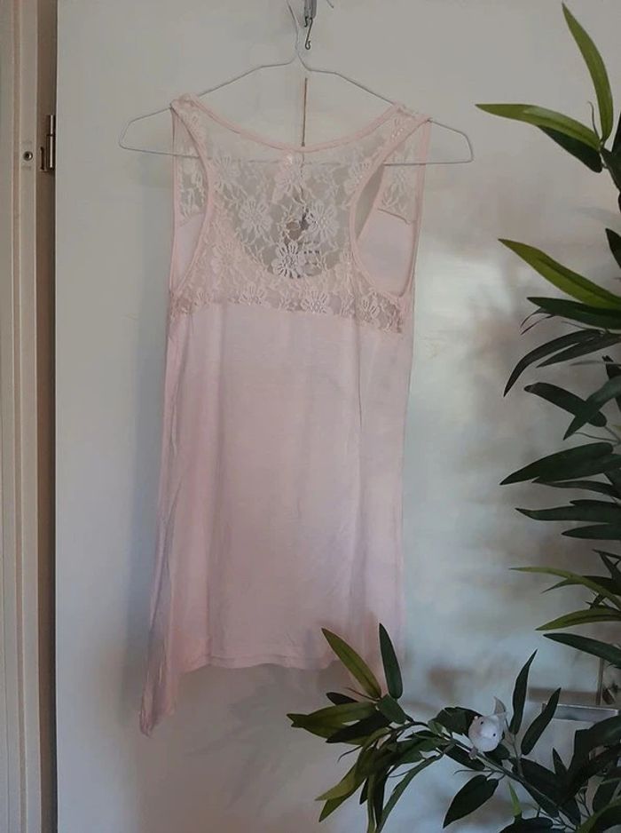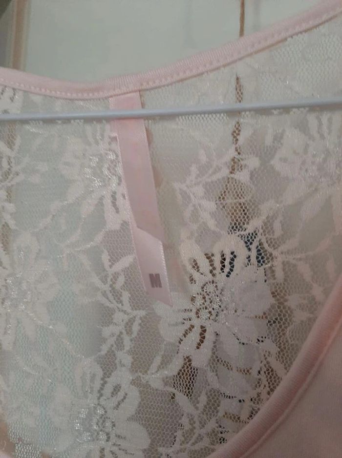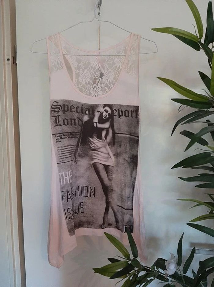 Top rose pâle avec effet une de magazine. Arrière en partie en dentelles. Déstructuré sur les côtés. Taille M. Porté 1 fois. Je le vends au prix de 7 euros. #TailleM38marine