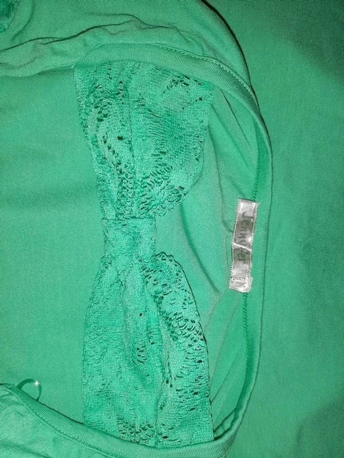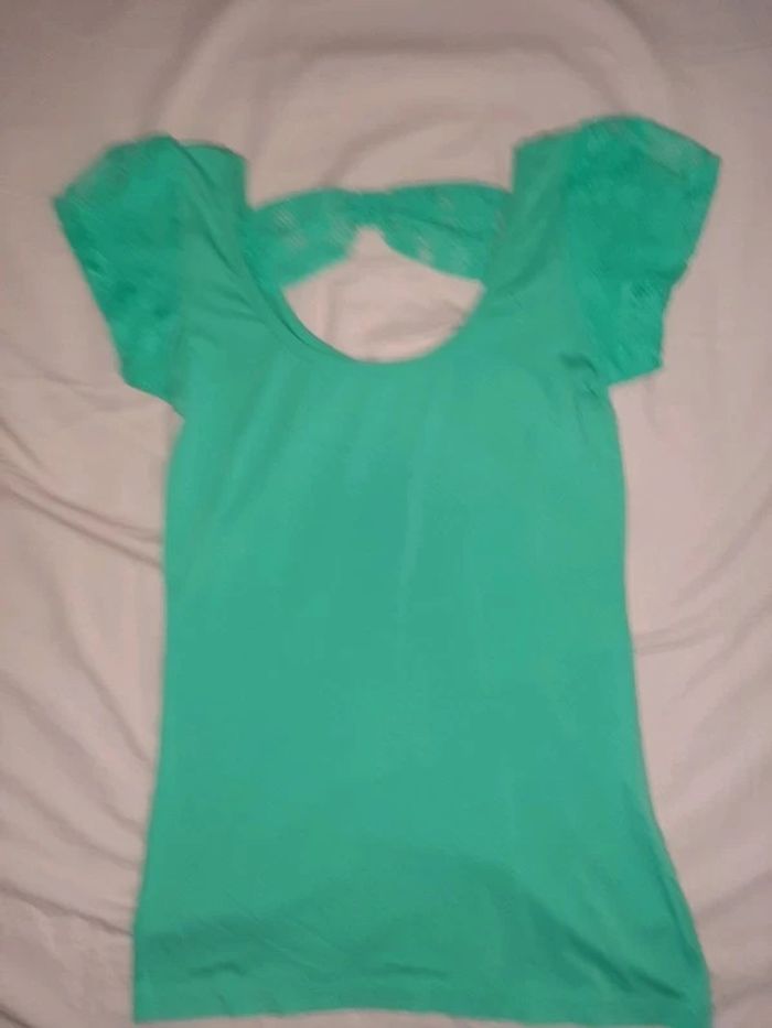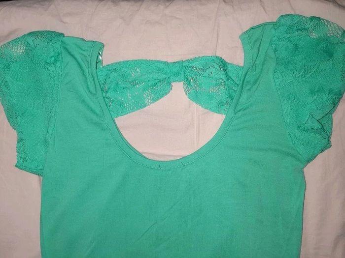 T-shirt vert d'eau. Un peu plus clair en vrai. Manches en dentelles. Noeud en dentelle dans le dos. Taille M. Jamais porté. Je le vends au prix de 7 euros. #TailleM38marine