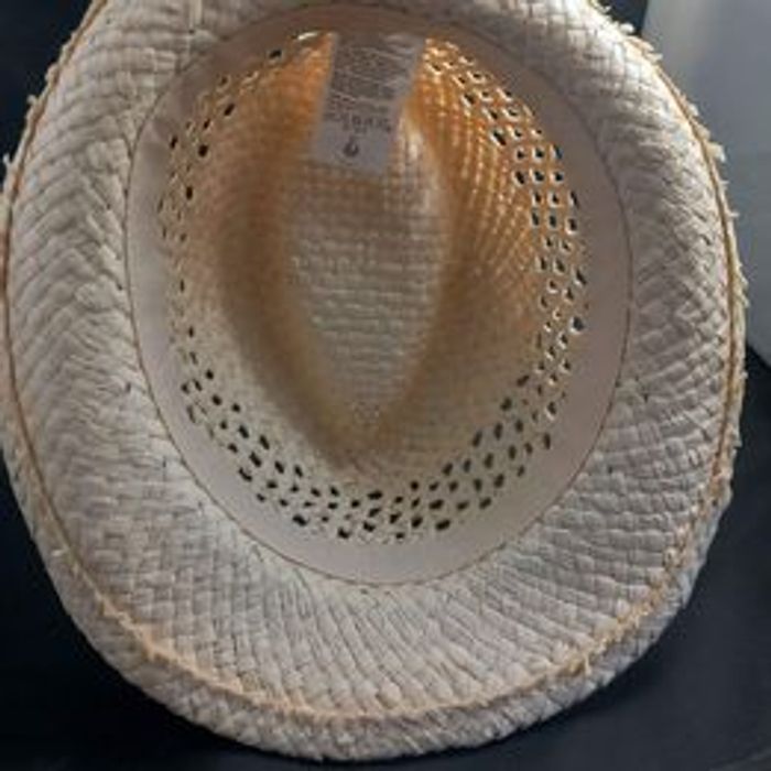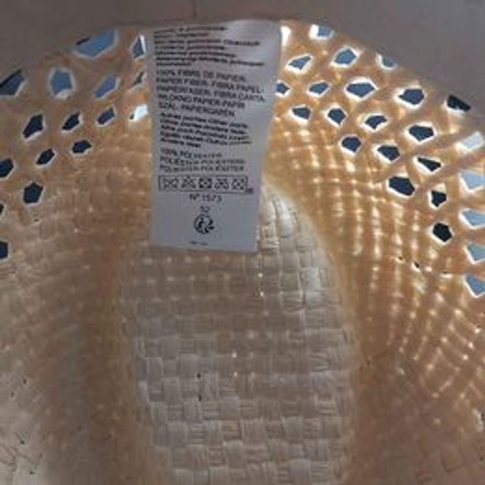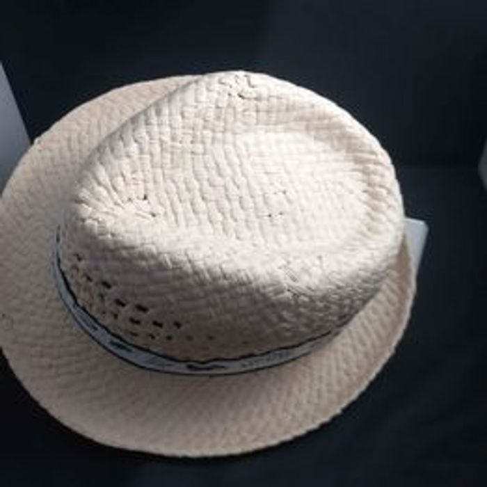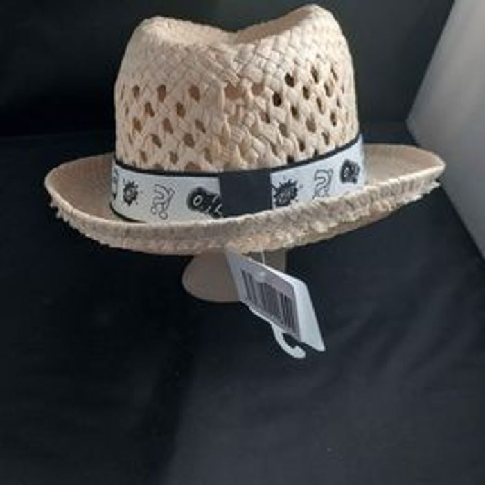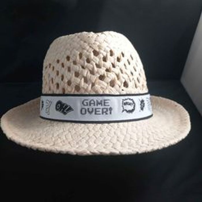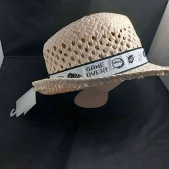 Chapeau de paille garçon Avec tissus écrit game over etc.... Couleurs noir, blanc et beige Taille 52 Matière principale 100% fibre de papier Autre parties 100% polyester Dimensions approximative 11cm de haut : 26cm de long : 23cm de large Neuf encore avec étiquettes