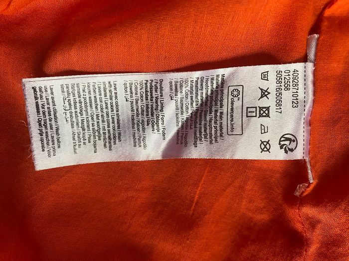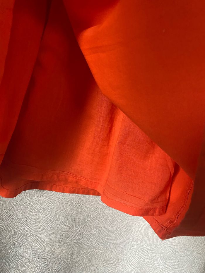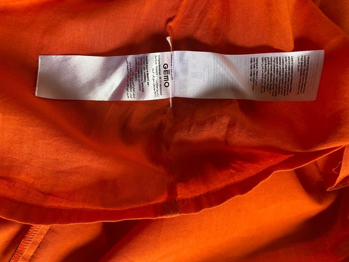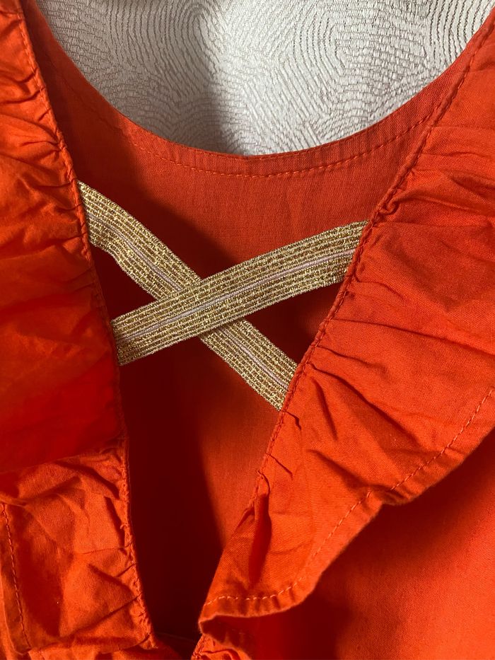 Robe d’été orange dos nu avec Volants Croisillon élastique doré Doublée Quelques décolorations par endroits en y regardant de très très près ( vraiment discret mais je préfère le spécifier ) Taille 6 ans Gémo