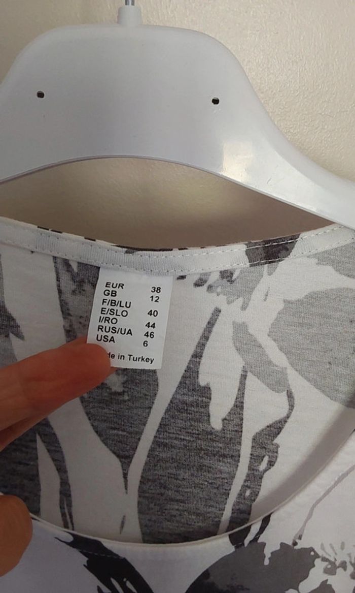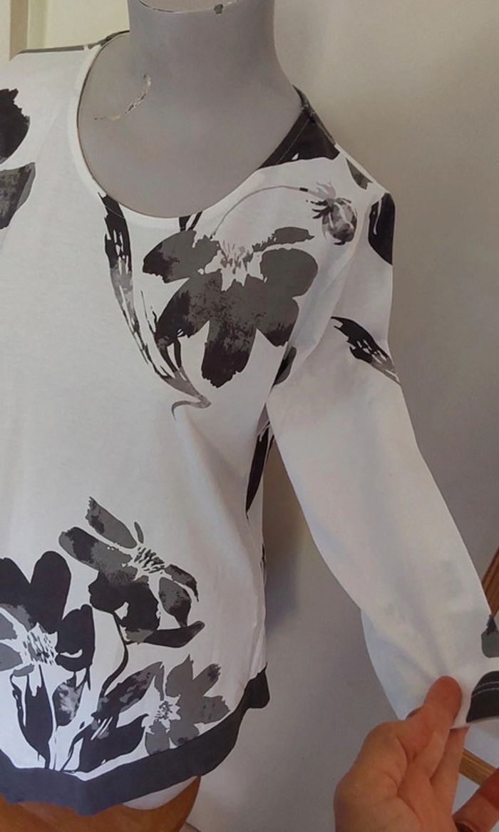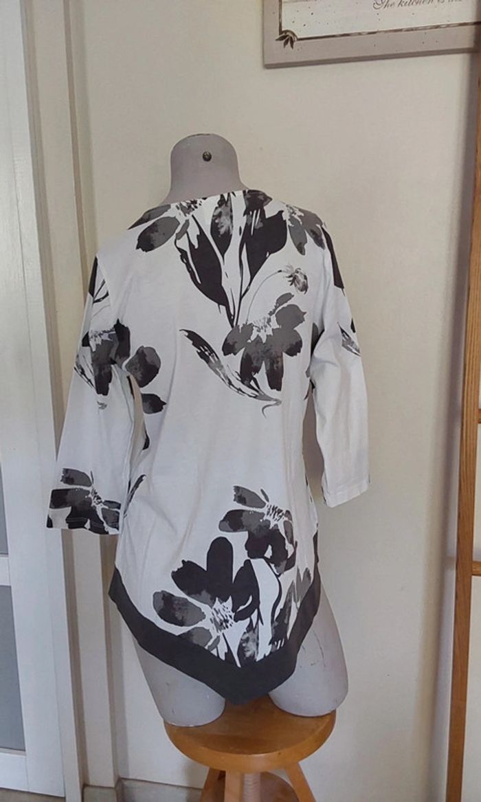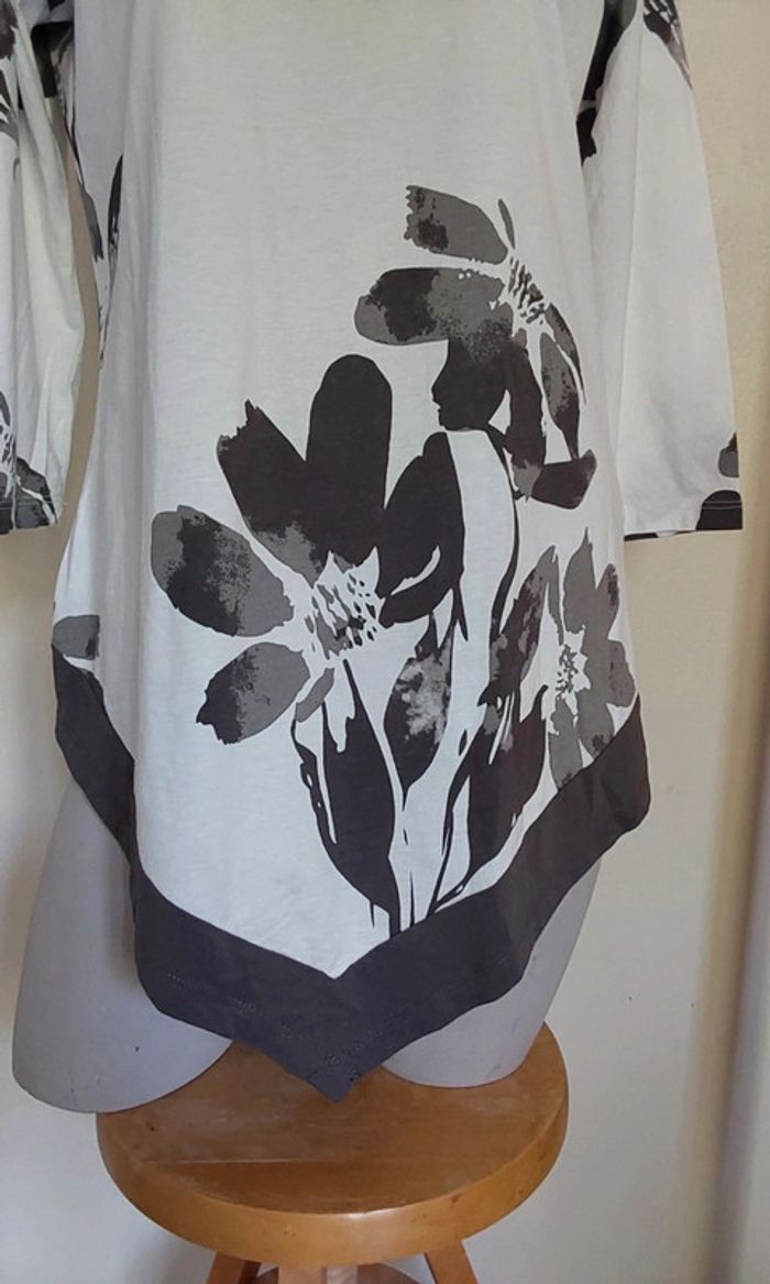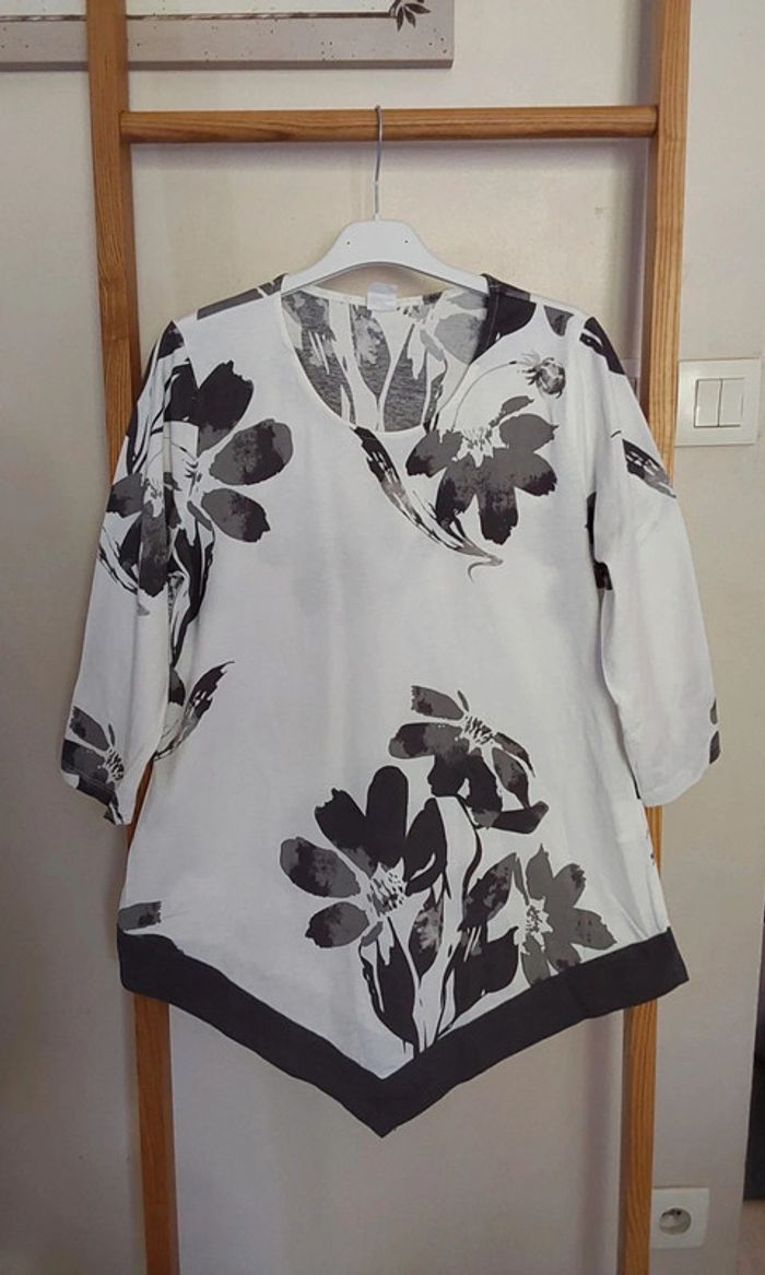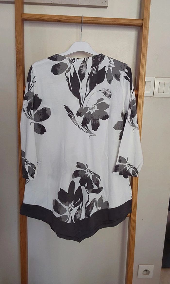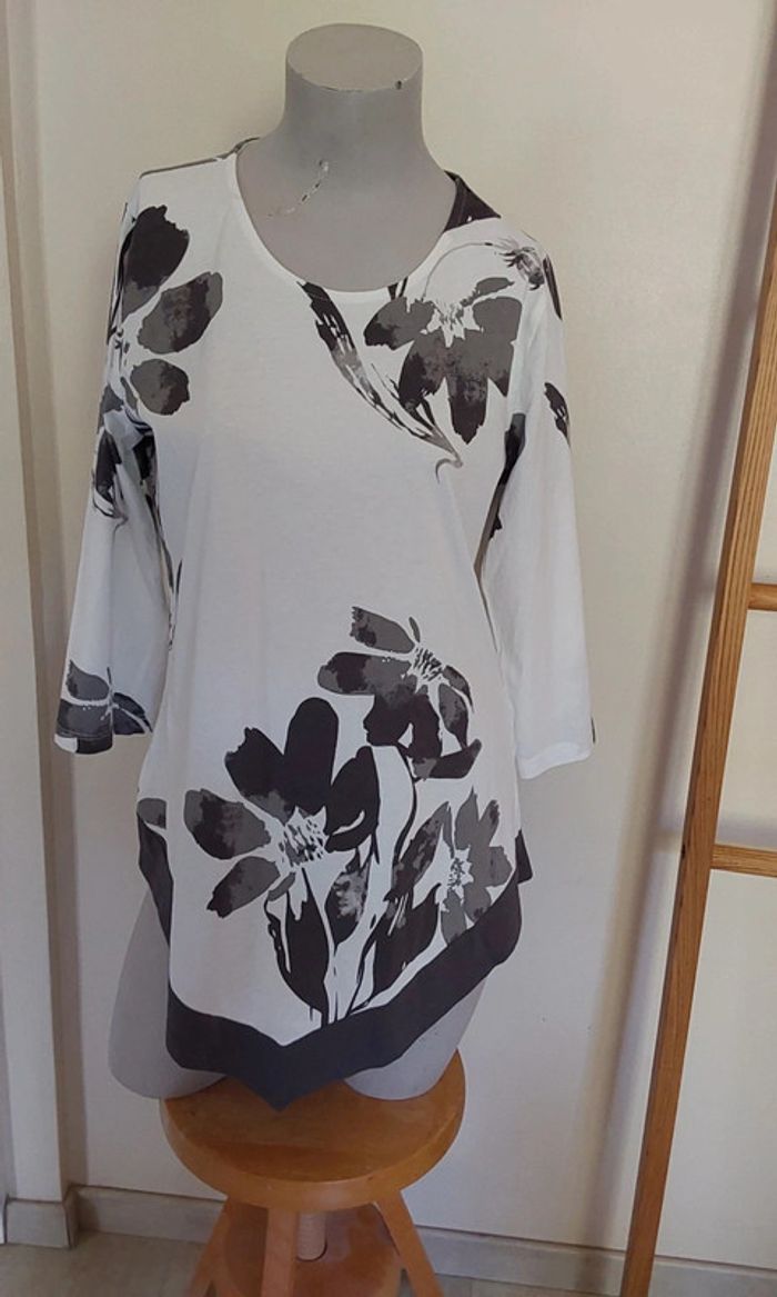 Haut blanc fleuri gris clair et gris anthracite. Manches 3/4 ,longueur 43 cm Aisselles à aisselles 49 cm Longueur à la pointe 77 cm Longueur sur les côtés 63 cm Pour la suite .... #legrenierdeprovence38 #bohème #vintage #coppenrath #campagne #champêtre #hippie #hippiechic