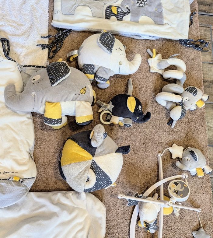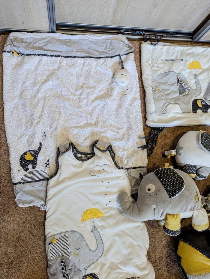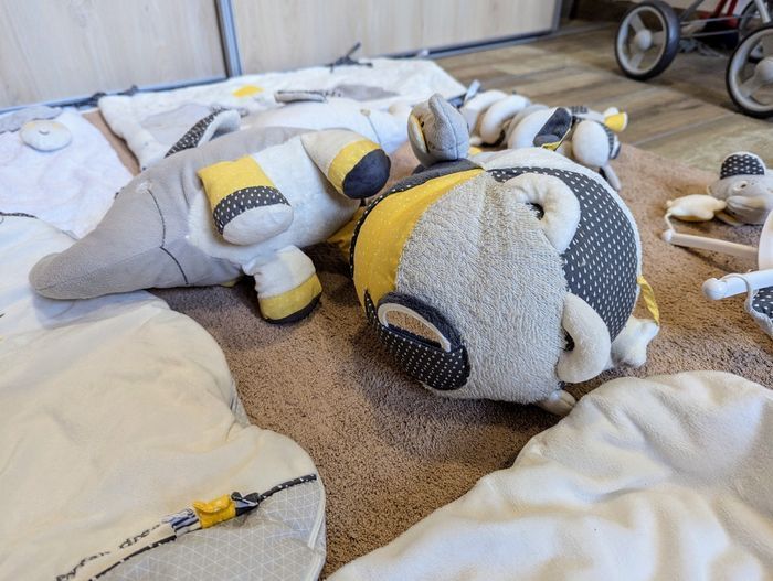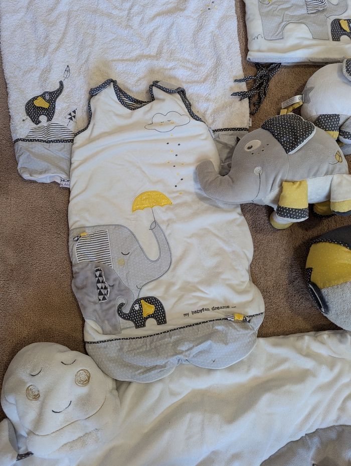 Collection BabyFan (12 pièces) marque Aubert - tapis d'éveil - gigoteuse 0-6 mois - pyjama BabyFan - housse pour matelas allongé - Tour de lit avec coussin - mobil fonctionnel - 3 peluches - berceuse - doudou - attaché poussette - doudou pour poussette Maison non fumeur. Chambre bébé et accessoires