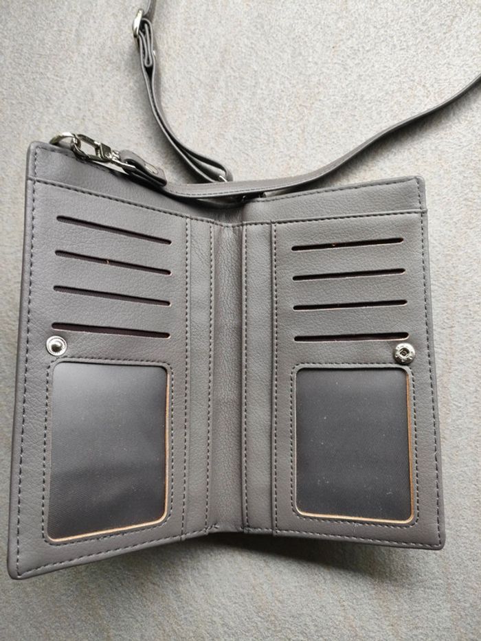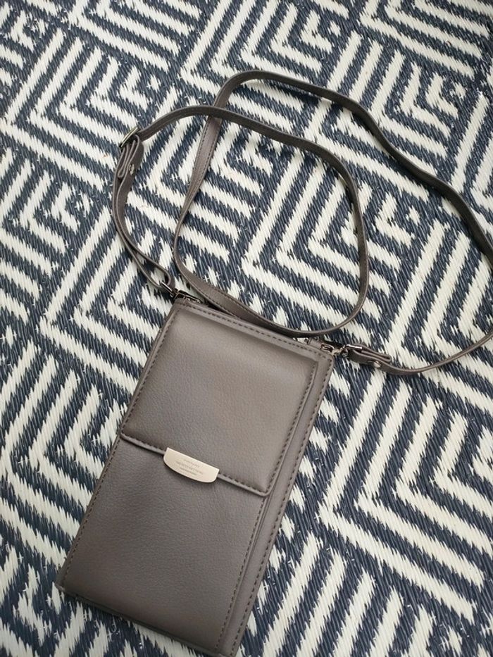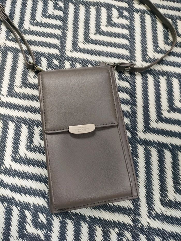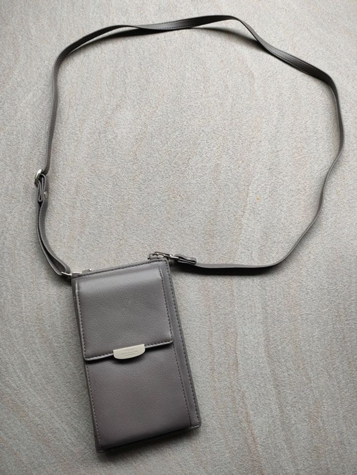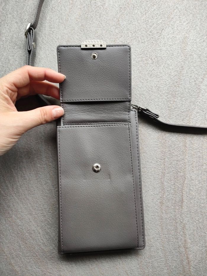 Petit sac bandoulière gris Possible de mettre un téléphone (suivant la taille bien sûr) Possible de mettre des cartes (8 cartes) Fait également porte monnaie Largeur total 11 cm Hauteur totale 18 cm Largeur pochette téléphone : 8 cm environ Hauteur pochette téléphone : 15 cm environ