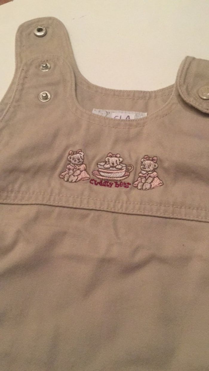 robe beige avec des oursons brodés ( voir photo ), une poche sur l’arrière ( voir photo) et qui possède des pressions aux épaules ( voir photo) #julie301101fille6-9mois