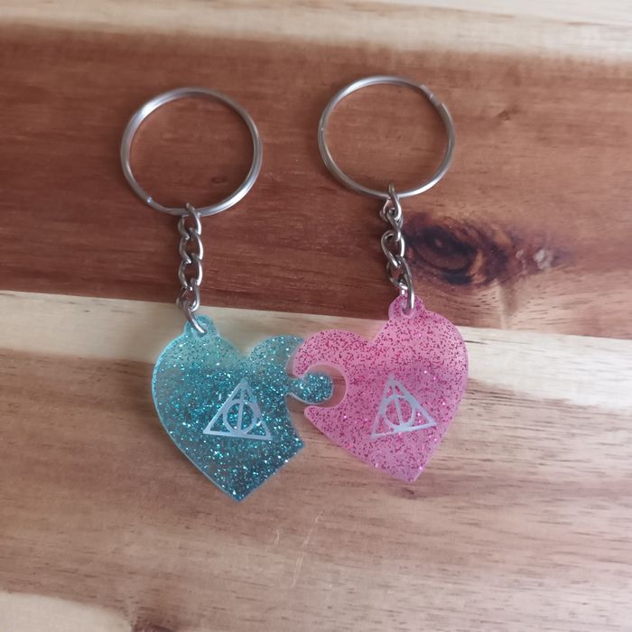 Lot de 2 porté clés cœurs avec les reliques de la mort. Idéal pour un couplé ou des amis fans de la saga Harry Potter acce