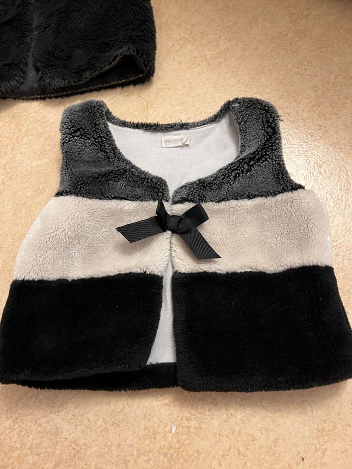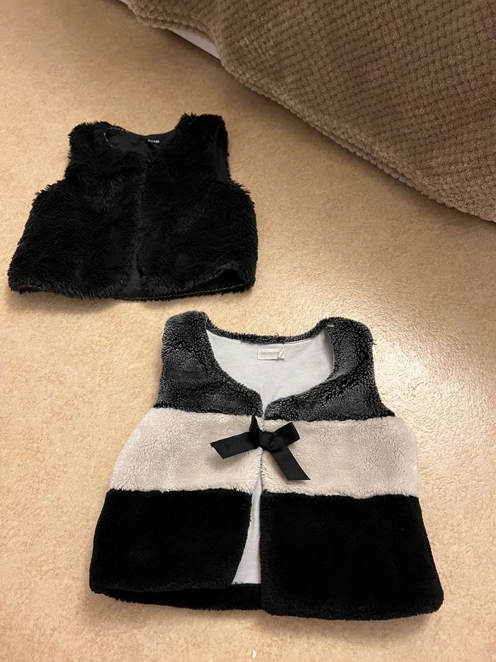 2 gilets sans manches Le noir c’est Kiabi 24 mois Et le trois coloris c’est Orchestra 3 ans