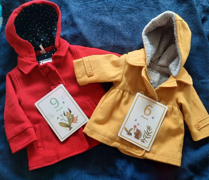 2 magnifiques manteaux fille Jaune: Verbaudet - 6 mois / porté mais très bon état Rouge: Orchestra - 9 mois / Peu porté