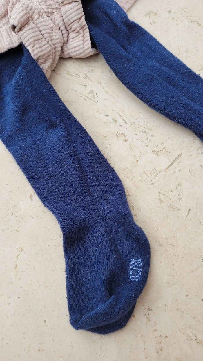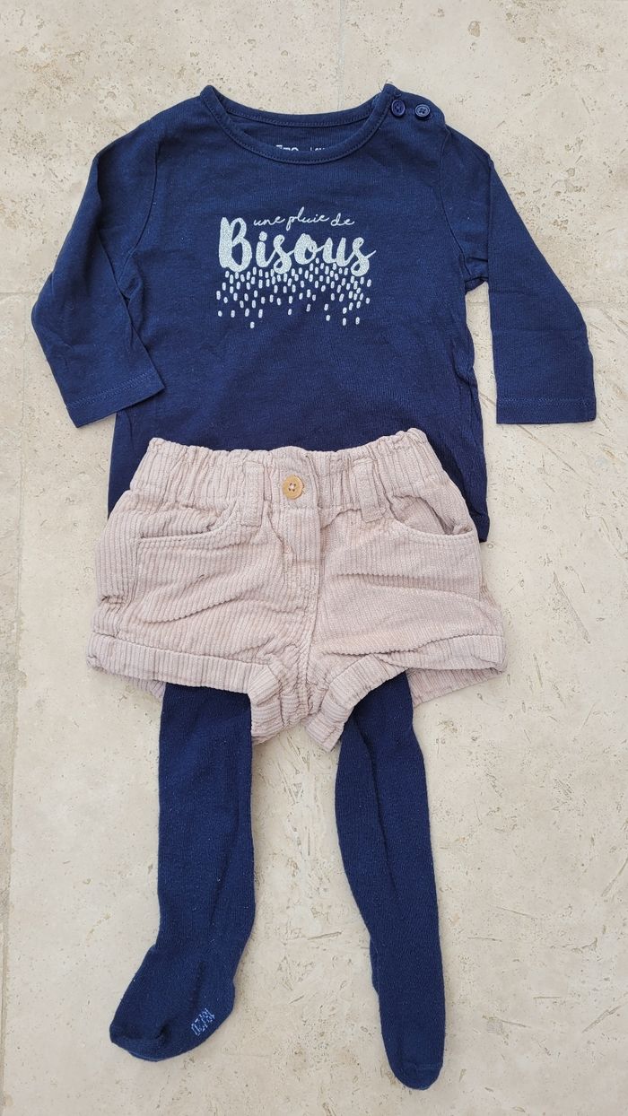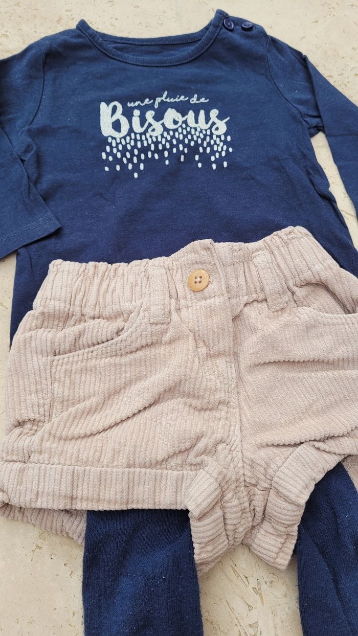 Tee-shirt ML bleu marine "pluie de bisous" & short en velour beige & collants bleus 18.20. 6mois.