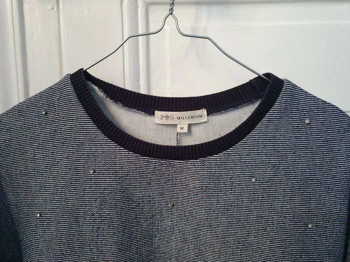 Sweat rayé bleu et blanc avec perles brillantes Marque Millénium Taille M Très peu porté