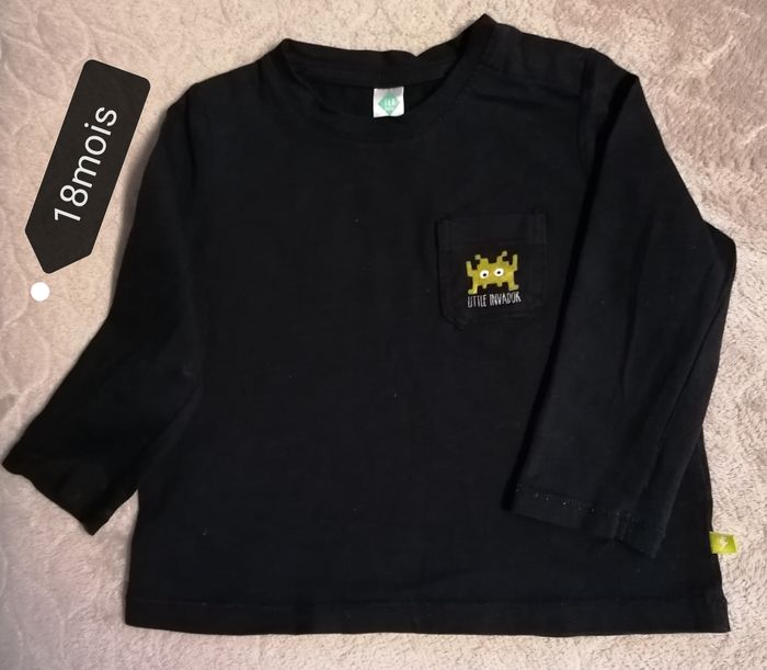 T. Shirts Manche longue garçon Marque tex baby Age 18mois Matières tissus 100 %coton Couleur bleu marine Petite poche en haut 2 bouton clipses niveau épaule Portée 2€