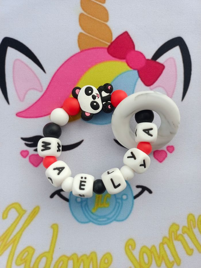Un anneau de dentition Panda pour soulager bébé durant ses poussées dentaires, sert à être mâchouillé en toute sécurité.  Respect des normes CE, composée de perles silicone alimentaire et/ou bois naturel. 100% personnalisable, énormément de choix de clips, perles, etc… Envoyez-moi un message afin de créer main dans la main votre accessoire idéal. Une photo du prototype de celui-ci vous est envoyé pour validation avant envoi.