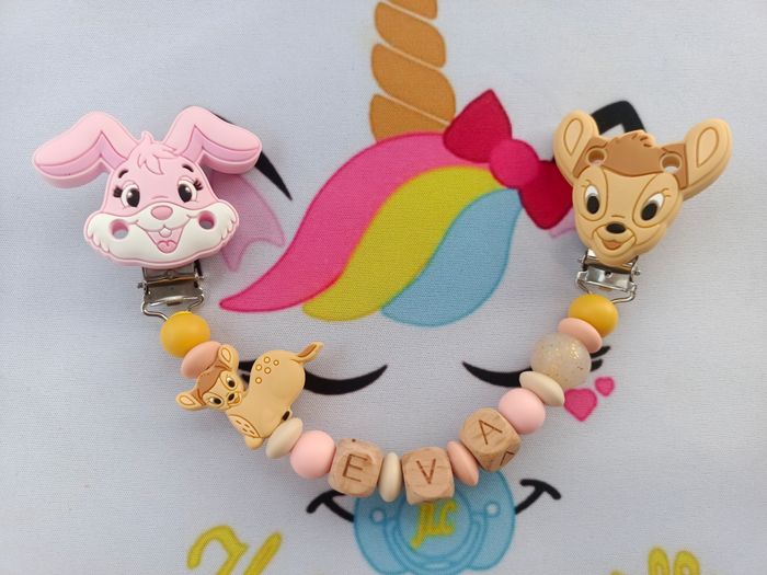 Une Attache doudou Bambi pour ne plus perdre le doudou avec deux clips pour accrocher aux tissus sans les abîmer, un pour le vêtement, l'autre au doudou. Respect des normes CE, composée de perles silicone alimentaire et/ou bois naturel. 100% personnalisable, énormément de choix de clips, perles, etc… Envoyez-moi un message afin de créer main dans la main votre accessoire idéal. Une photo du prototype de celui-ci vous est envoyé pour validation avant envoi.