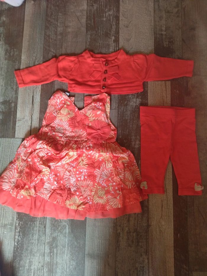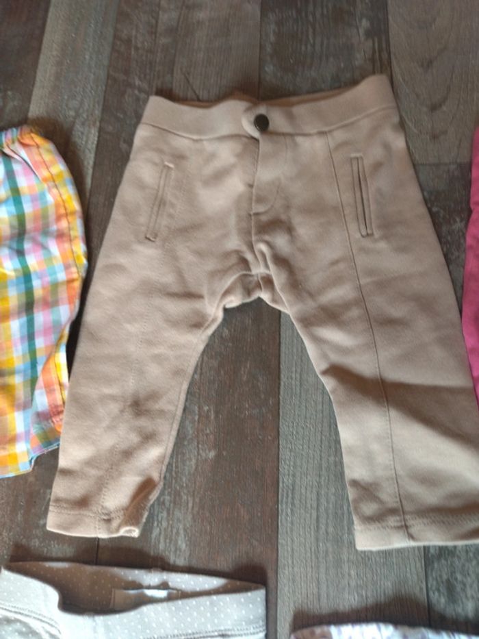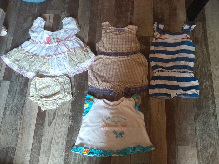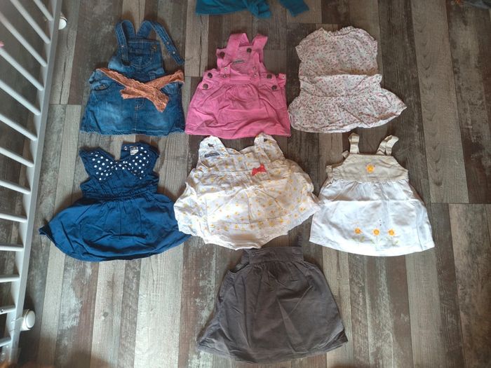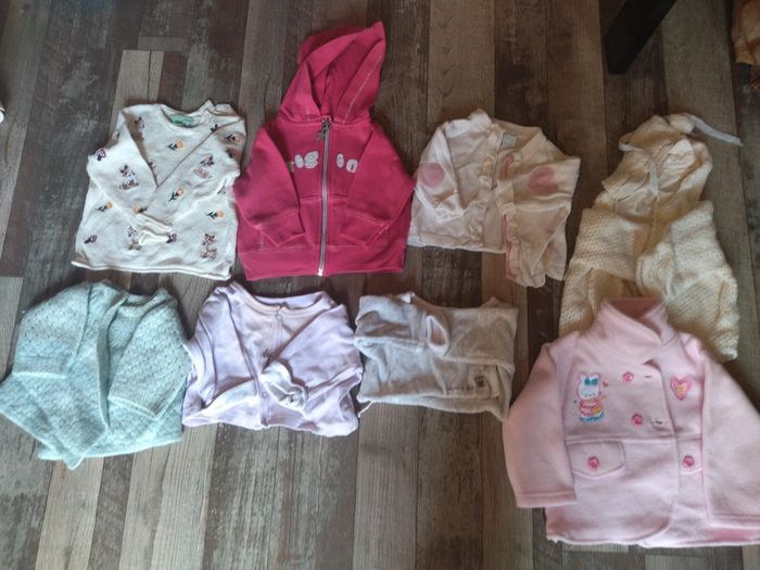 7 gilets 1 pull 1 ensemble pantalon tee shirt ML 1 ensemble robe pantalon gilet orange 9 bodies MC 2 combi short 1 robe avec culotte couche 1 débardeur 5 pyjamas ML 2 pyjamas MC 6 pantalons 1 collant 1 short 2 panta court 7 robes 4 tee shirt ML Plusieurs marque