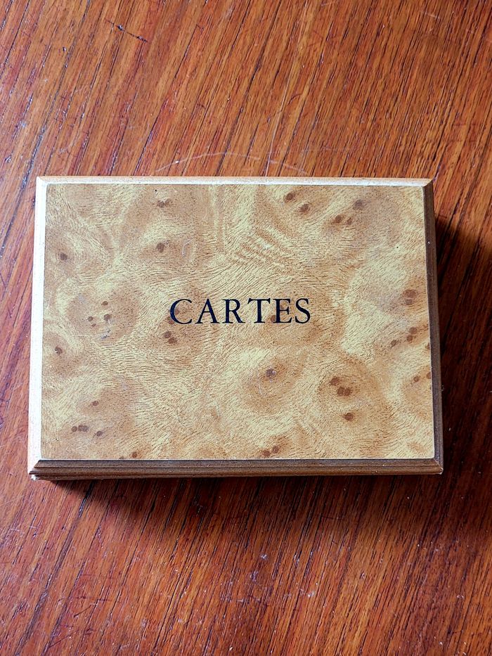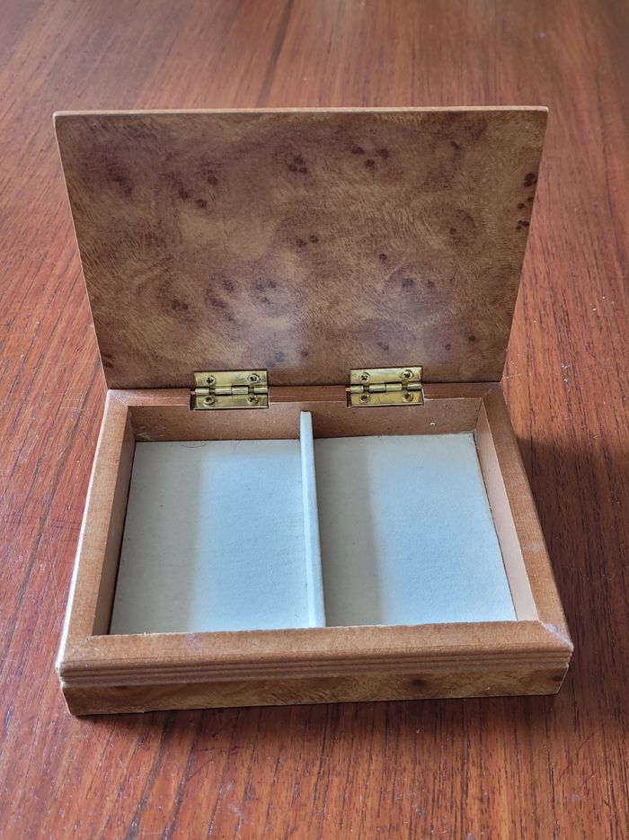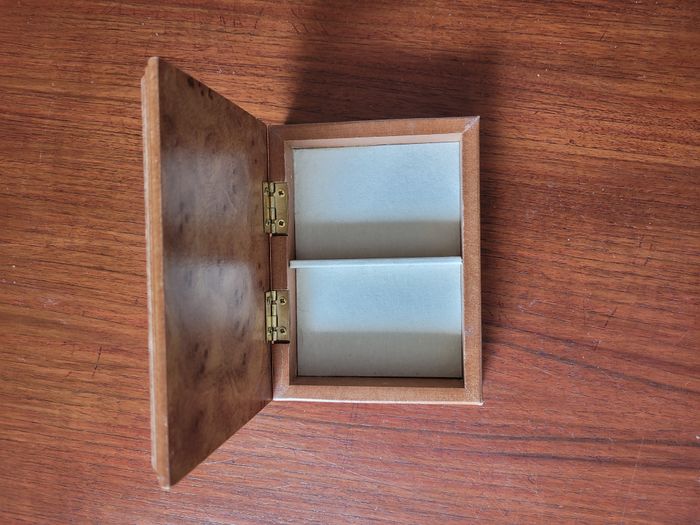années 90 en bois recouvert de papier motif acajou 2 compartiments garnis de velours blanc dimensions 14,5 x 11 x 4 cm dans l'état des photos, qui font partie du descriptif