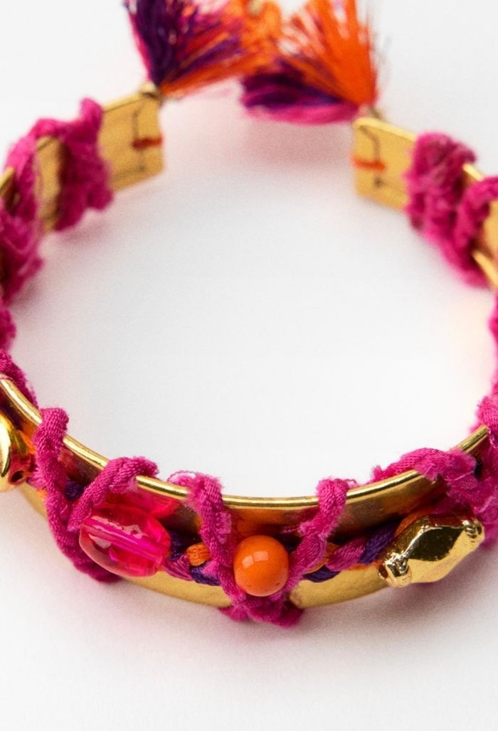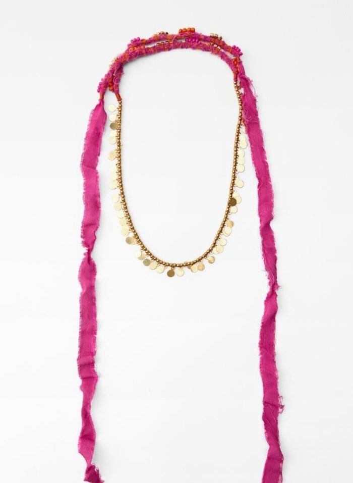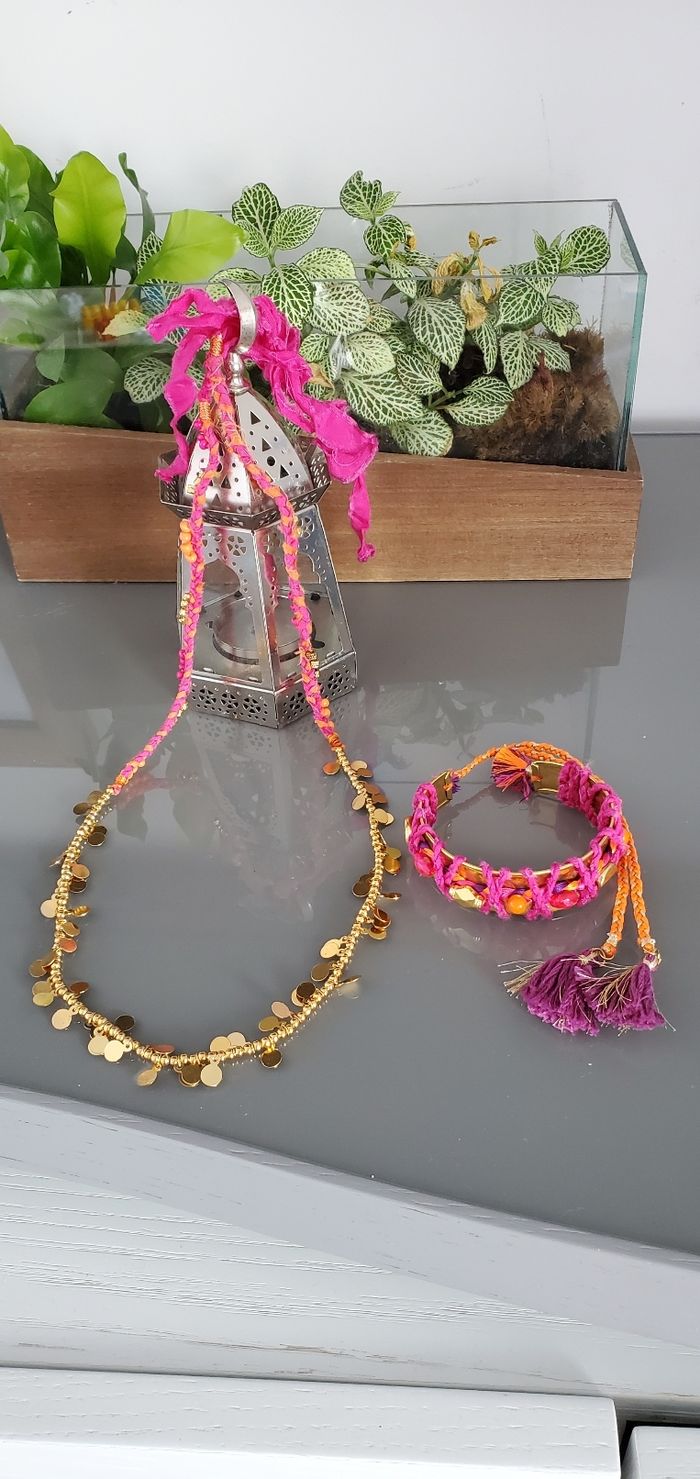 Lot Bracelet et Collier long tissé en fil tressé bimatière en contraste et pièces métalliques. Détail application de verroteries colorées. Fermeture par laçage. Marque zara, en très bon état.