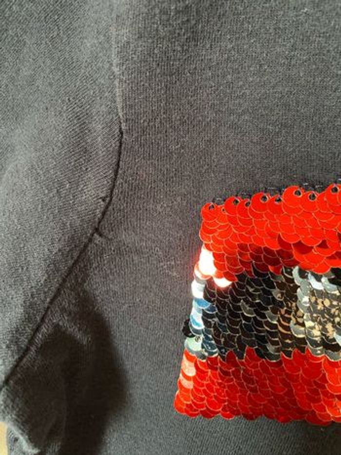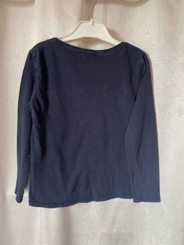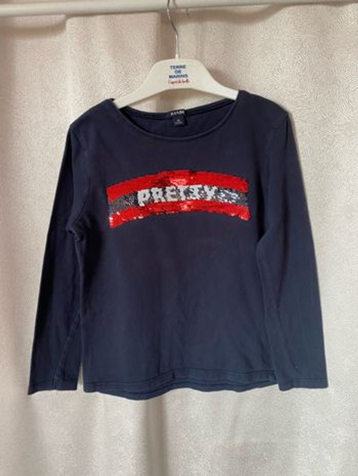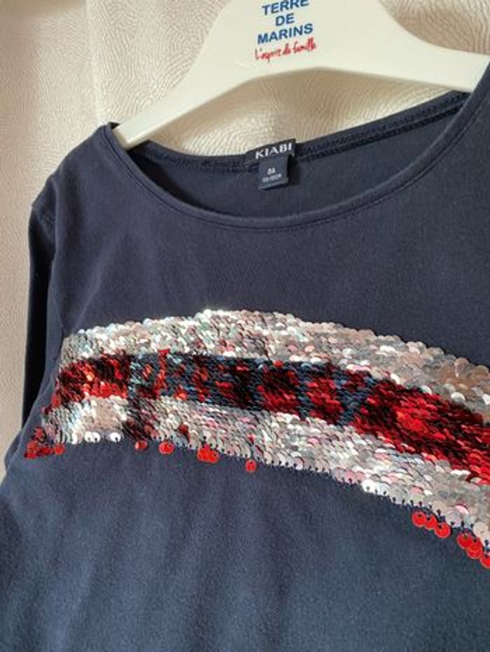 T-shirt manches longues bleu marine sequins rouge et argent devant pretty Micro trou sur une emmanchure à la couture Taille 8 ans 126-131 cm Plus d’étiquette de composition kiabi