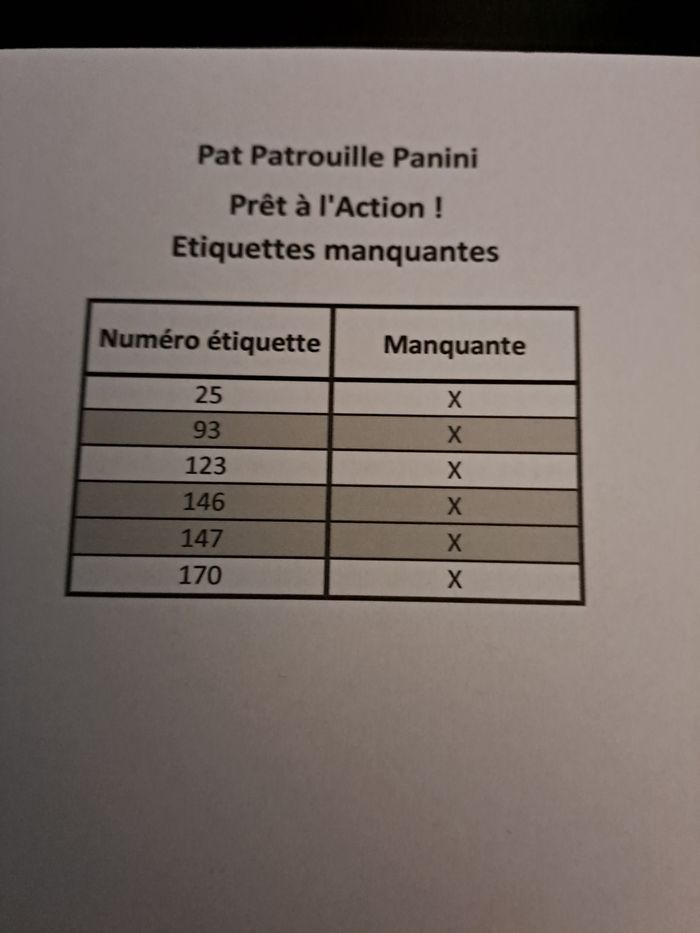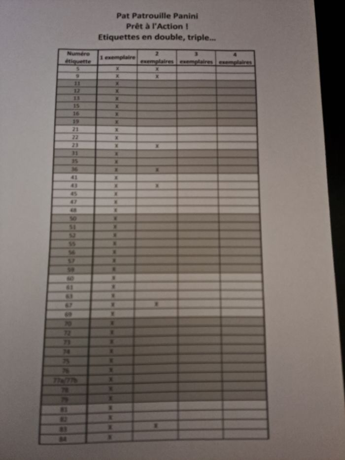 Me contacter avant d'acheter. Je vends mes doubles, triples... des stickers Pat patrouille Prêts à l'action ! panini. 20cts l'unité, je ne vends pas pour moins de 1€ au total. Mes manquantes sont sur la dernière photo.