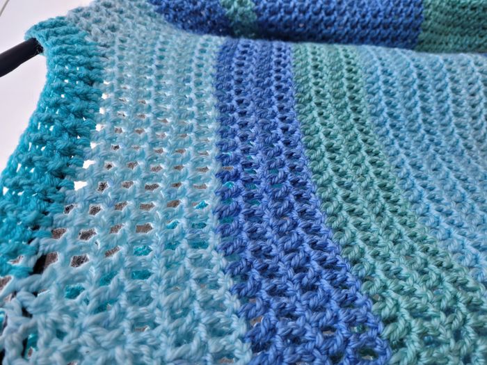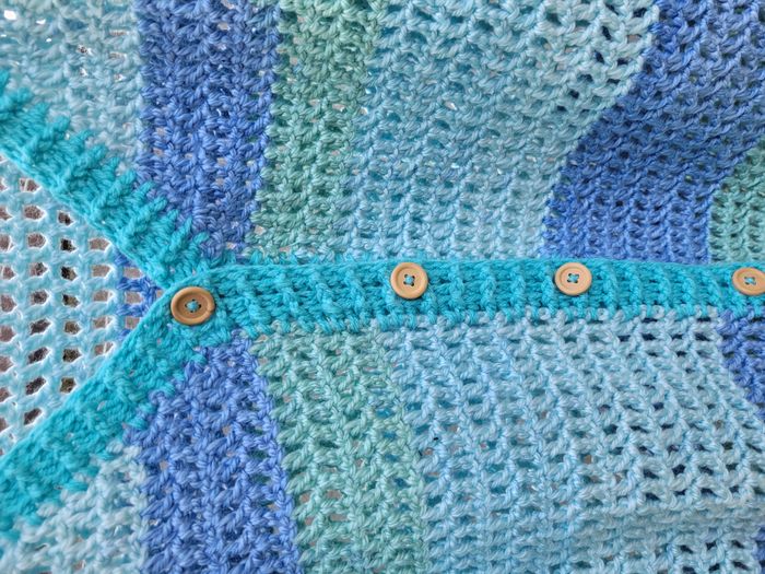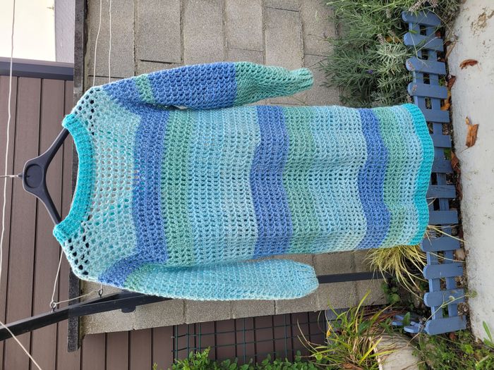années 70 / 80 très peu porté en laine et acrylique maille ajourée ce qui permet de s'adapter à plusieurs morphologies et tailles couleurs : bleu clair, bleu turquoise, bleu lavande et vert pâle bouton en bois dimensions à plat hauteur 94 cm largeur de poitrine 53 cm longueur manche 53 cm