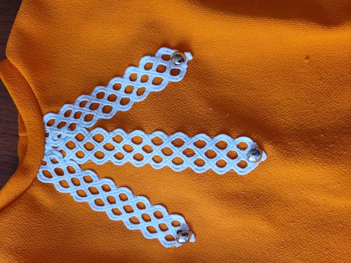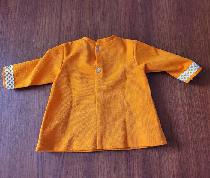 années 60 / 70 en très bon état, juste un fils de tiré en synthétique orange décoré de dentelle blanche et de bouton boule doré boutonnage dans le dos