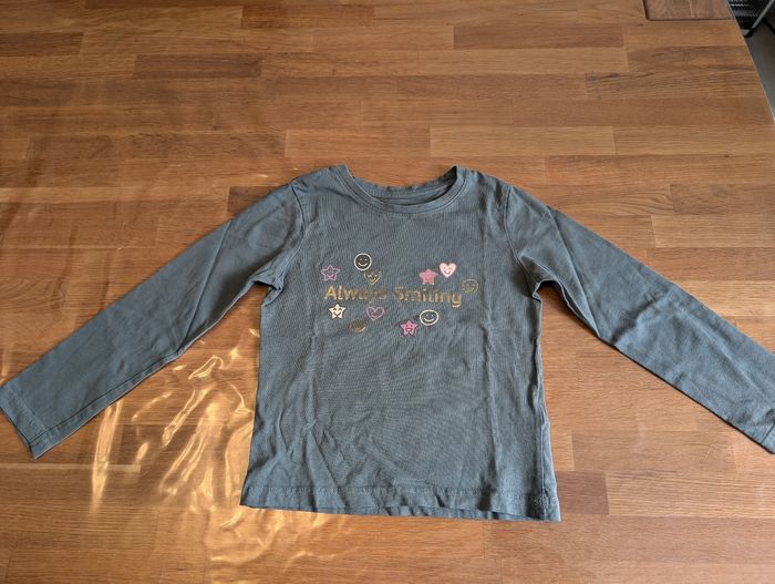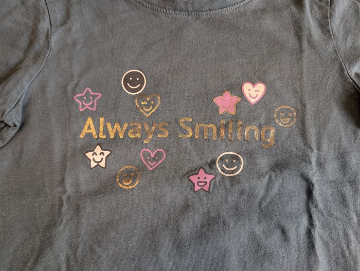 T-shirt fille 7 ans Primark Bon état voire très bon état, vert, inscription Always smiling, coton.