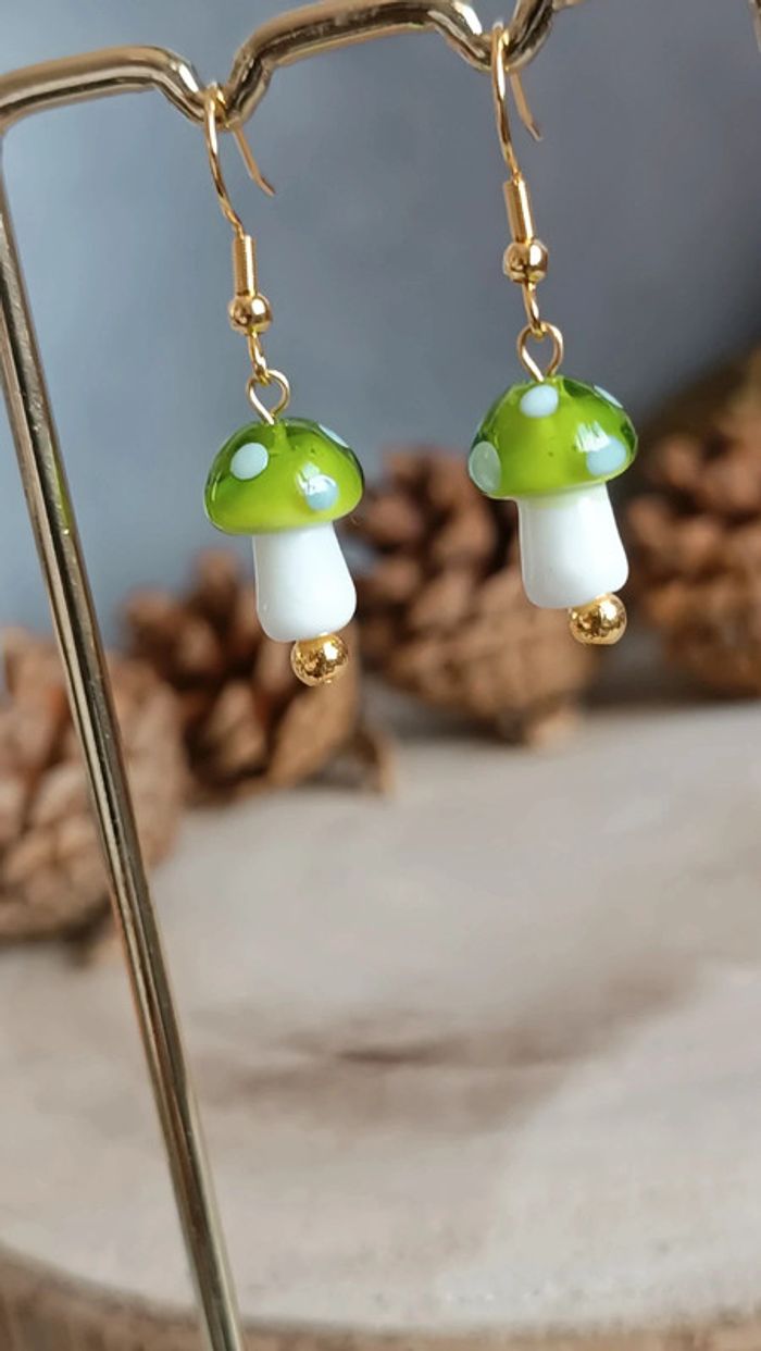 Jolies boucles d'oreilles petits champignons verts, perles en verre 💚 Crochet en acier inoxydable Pour toute demande de lot, m'envoyer un message avec la capture d'écran des articles voulus et je m'en occupe ✨ Envoi rapide et soigné 🤗 Belle découverte ☀️ - Les bijoux en base d'acier inoxydable sont théoriquement résistants à l'eau. Néanmoins, je conseille, pour la durabilité, d'éviter le contact prolongé de vos bijoux fantaisie avec l'eau, le chlore, le parfum, et de les ranger à l'abri du soleil pour une parfaite tenue dans le temps 🤗 - Éviter complètement l'eau pour les bijoux comportant des pierres naturelles, perles de rocailles, acryliques, bois ... - Pour toute question, ou demande, un petit message 🤗 - Abonnez-vous à mon profil vinted pour ne rien louper 👍 #bijouxfantaisie #y2k #cadeaufemme #cadeau #tendance #style #zara #accessoires #acierinoxydable #neuf