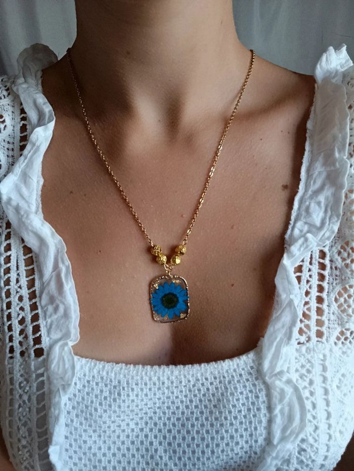 Joli collier avec fleur bleue dans de la résine perles dorées Chaine acier inoxydable Fait avec ❤️ Vendeuse pro, prix fixes 💫 Pour toute demande de lot, m'envoyer un message avec la capture d'écran des articles voulus et je m'en occupe ✨ Envoi rapide et soigné 🤗 Belle découverte ☀️ - Les bijoux en base d'acier inoxydable sont théoriquement résistants à l'eau. Néanmoins, je conseille, pour la durabilité, d'éviter le contact prolongé de vos bijoux fantaisie avec l'eau, le chlore, le parfum, et de les ranger à l'abri du soleil pour une parfaite tenue dans le temps 🤗 - Éviter complètement l'eau pour les bijoux comportant des pierres naturelles, perles de rocailles, acryliques, bois ... - Pour toute question, ou demande, un petit message 🤗 - Abonnez-vous à mon profil vinted pour ne rien louper 👍 #bijoux #bijouxfantaisie #bijouxfemme #bijouxhomme #bracelethomme #cadeaufemme #cadeau #bouclesdoreilles #braceletfemme #colierfemme #tendance #intemporel #style #accessoires #pierrenaturelle #acierinoxydable #neuf