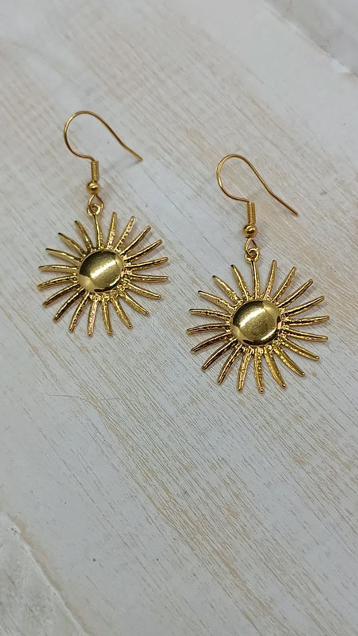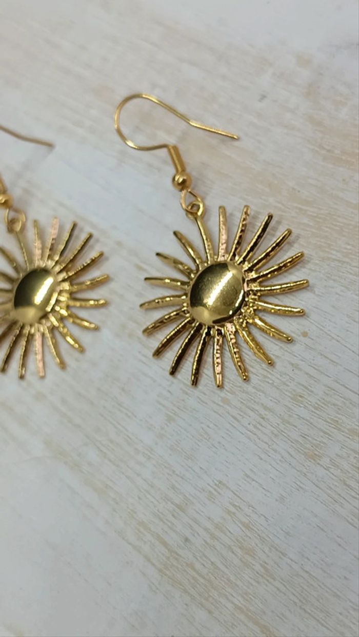 Boucles soleil en acier inoxydable doré Fait avec ❤️ Vendeuse pro, prix fixes 💫 Pour toute demande de lot, m'envoyer un message avec la capture d'écran des articles voulus et je m'en occupe ✨ Envoi rapide et soigné 🤗 Belle découverte ☀️ - Les bijoux en base d'acier inoxydable sont théoriquement résistants à l'eau. Néanmoins, je conseille, pour la durabilité, d'éviter le contact prolongé de vos bijoux fantaisie avec l'eau, le chlore, le parfum, et de les ranger à l'abri du soleil pour une parfaite tenue dans le temps 🤗 - Éviter complètement l'eau pour les bijoux comportant des pierres naturelles, perles de rocailles, acryliques, bois ... - Pour toute question, ou demande, un petit message 🤗 - Abonnez-vous à mon profil vinted pour ne rien louper 👍 #bijoux #bijouxfantaisie #bijouxfemme #bijouxhomme #bracelethomme #cadeaufemme #cadeau #bouclesdoreilles #braceletfemme #colierfemme #tendance #intemporel #style #accessoires #pierrenaturelle #acierinoxydable #neuf