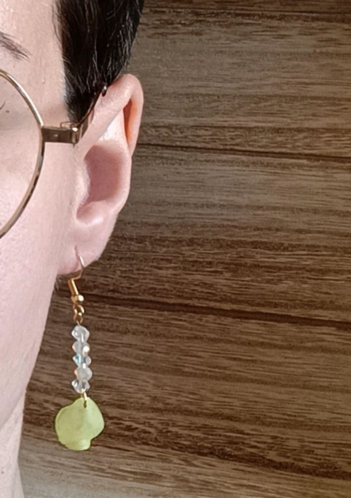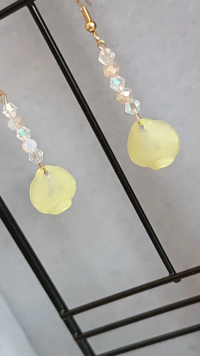 Jolie paire de boucles d'oreilles , crochet en plaquê or , perles a facettes et petit pétales Dans les tons jaune pâle 🌸 Fines et délicates ☺️🥰 Fait avec ❤️ Vendeuse pro, prix fixes 💫 Pour toute demande de lot, m'envoyer un message avec la capture d'écran des articles voulus et je m'en occupe ✨ Envoi rapide et soigné 🤗 Belle découverte ☀️ - Les bijoux en base d'acier inoxydable sont théoriquement résistants à l'eau. Néanmoins, je conseille, pour la durabilité, d'éviter le contact prolongé de vos bijoux fantaisie avec l'eau, le chlore, le parfum, et de les ranger à l'abri du soleil pour une parfaite tenue dans le temps 🤗 - Éviter complètement l'eau pour les bijoux comportant des pierres naturelles, perles de rocailles, acryliques, bois ... - Pour toute question, ou demande, un petit message 🤗 - Abonnez-vous à mon profil vinted pour ne rien louper 👍 #bijoux #bijouxfantaisie #bijouxfemme #bijouxhomme #bracelethomme #cadeaufemme #cadeau #bouclesdoreilles #braceletfemme #colierfemme #tendance #intemporel #style #accessoires #pierrenaturelle #acierinoxydable #neuf