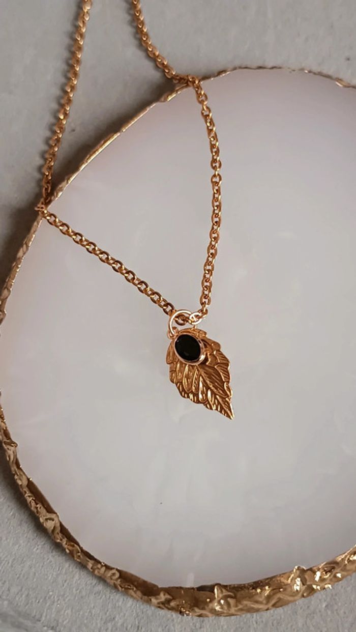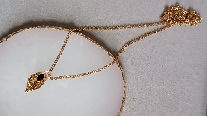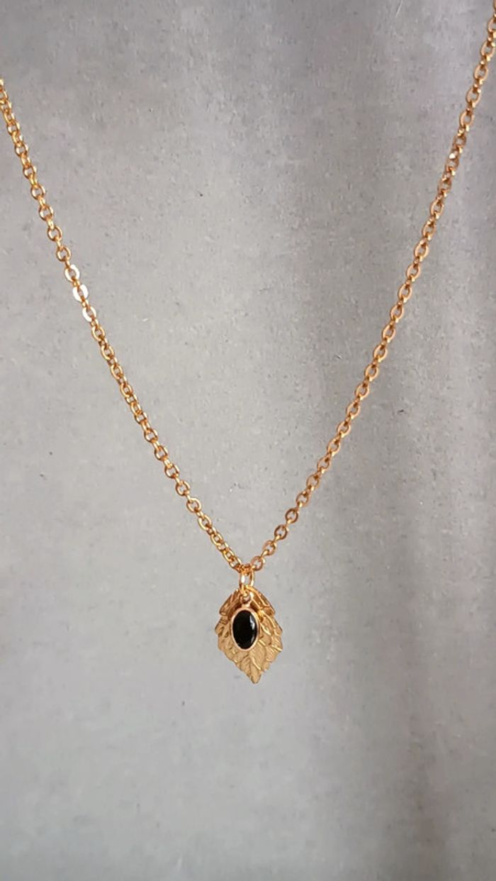 Joli collier en acier inoxydable, feuille dorée et petit pendentif noir ❤️ Fin et delicat 🌸 Fait avec ❤️ Vendeuse pro, prix fixes 💫 Pour toute demande de lot, m'envoyer un message avec la capture d'écran des articles voulus et je m'en occupe ✨ Envoi rapide et soigné 🤗 Belle découverte ☀️ - Les bijoux en base d'acier inoxydable sont théoriquement résistants à l'eau. Néanmoins, je conseille, pour la durabilité, d'éviter le contact prolongé de vos bijoux fantaisie avec l'eau, le chlore, le parfum, et de les ranger à l'abri du soleil pour une parfaite tenue dans le temps 🤗 - Éviter complètement l'eau pour les bijoux comportant des pierres naturelles, perles de rocailles, acryliques, bois ... - Pour toute question, ou demande, un petit message 🤗 - Abonnez-vous à mon profil vinted pour ne rien louper 👍 #bijoux #bijouxfantaisie #bijouxfemme #bijouxhomme #bracelethomme #cadeaufemme #cadeau #bouclesdoreilles #braceletfemme #colierfemme #tendance #intemporel #style #accessoires #pierrenaturelle #acierinoxydable #neuf